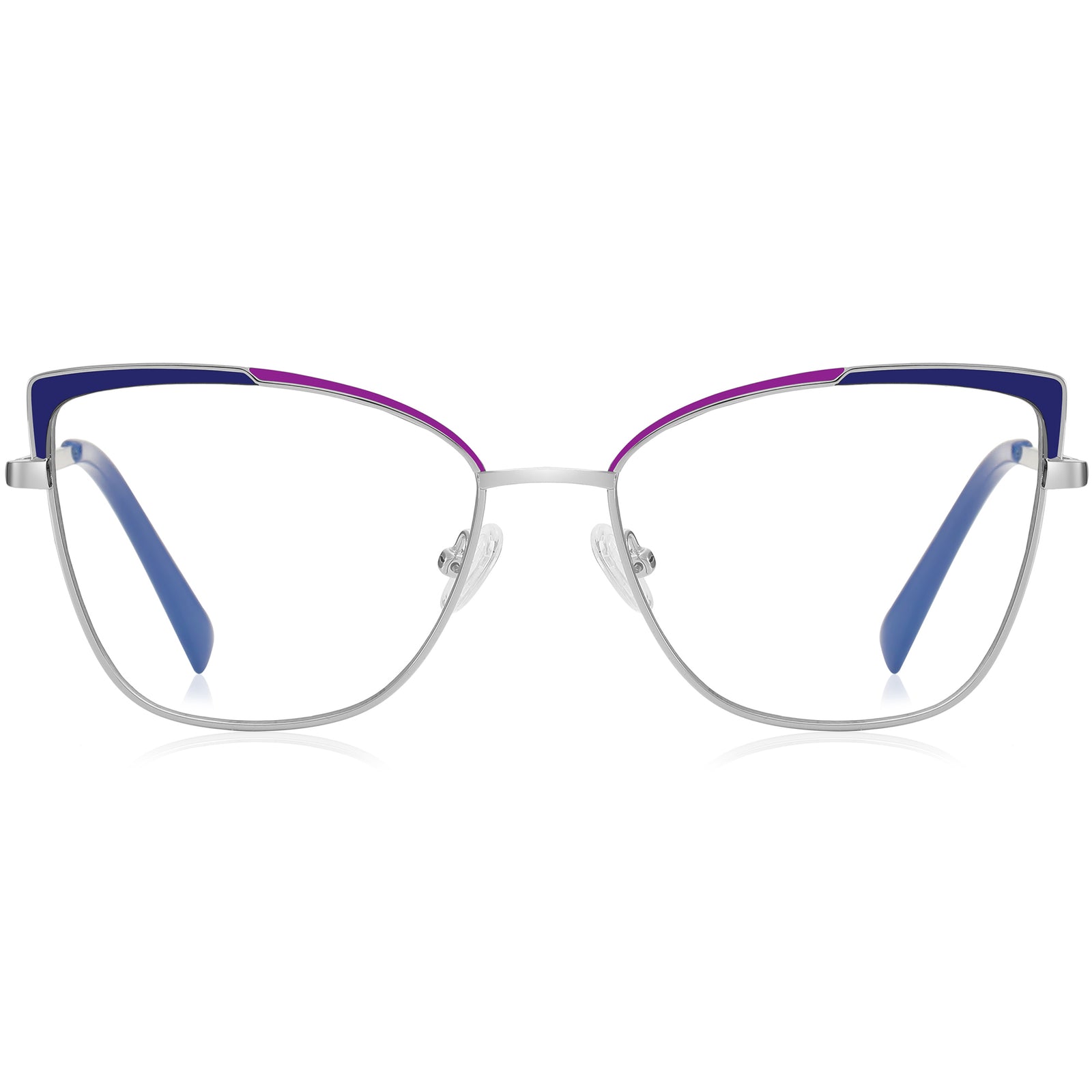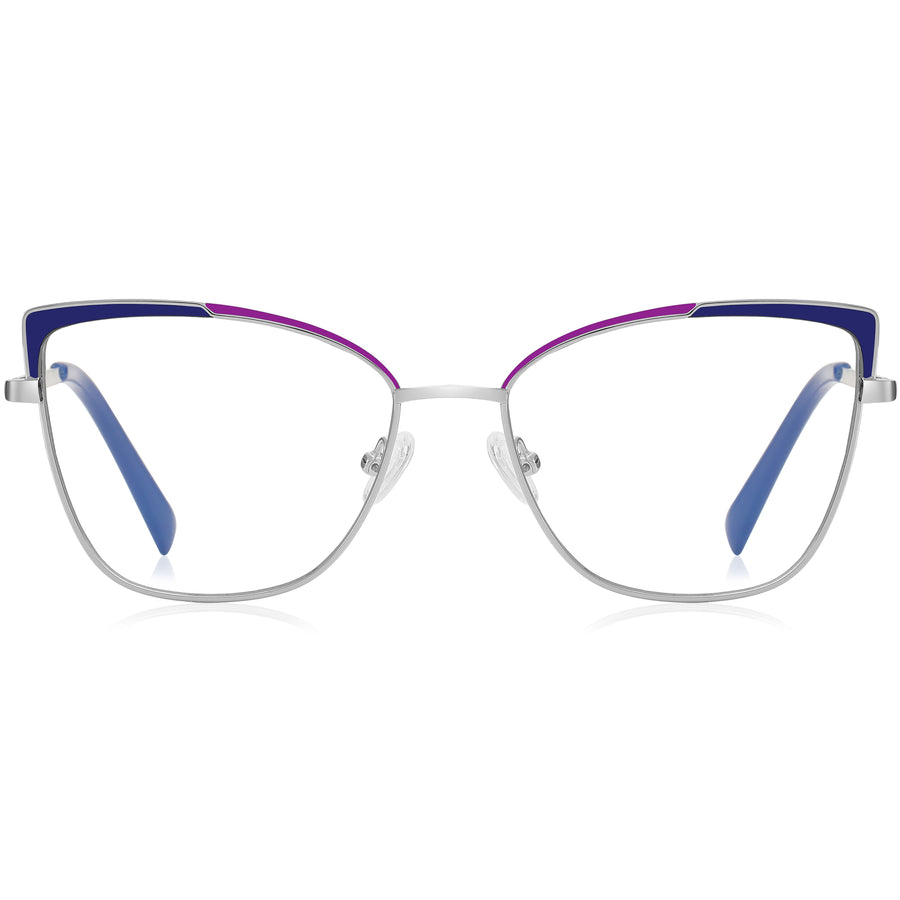 These modern cat-eye glasses feature a unique metal frame accented with contrasting color details on the upper rims. Designed for comfort, they are lightweight with adjustable nose pads, acetate temple tips and spring hinges. The extended, universal bridge fit ensures a perfect fit. Ultra-lightweight, they look great with fashion-tinted lenses, adding a chic touch to any outfit.