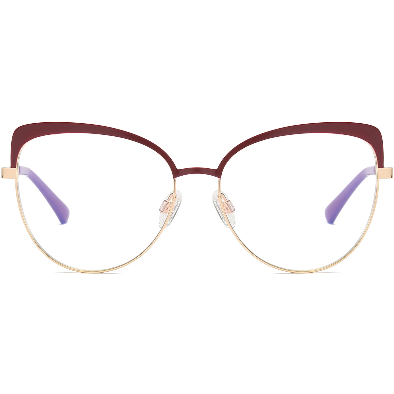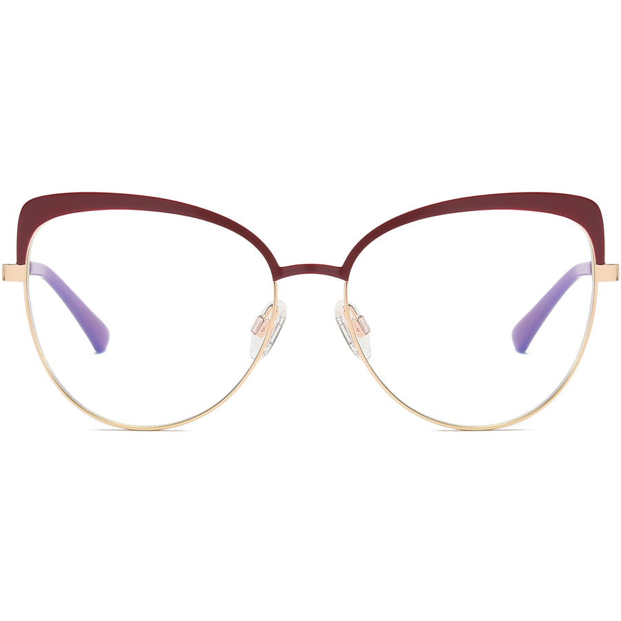 Modern feline flair, minus the weight. A slim metal outline meets a matte enamel brow to create a softly pointed cat-eye silhouette that flatters every face. Two-tone styling—burgundy/gold, midnight/navy, or onyx/champagne—adds a hint of luxe, while slim temples with color-block insets keep the look fresh, not fussy. Adjustable nose pads, spring hinges, and cushioned acetate tips deliver all-day comfort. Dress it up, tone it down—these ultra-light frames effortlessly move from coffee runs to candlelit dinners.
