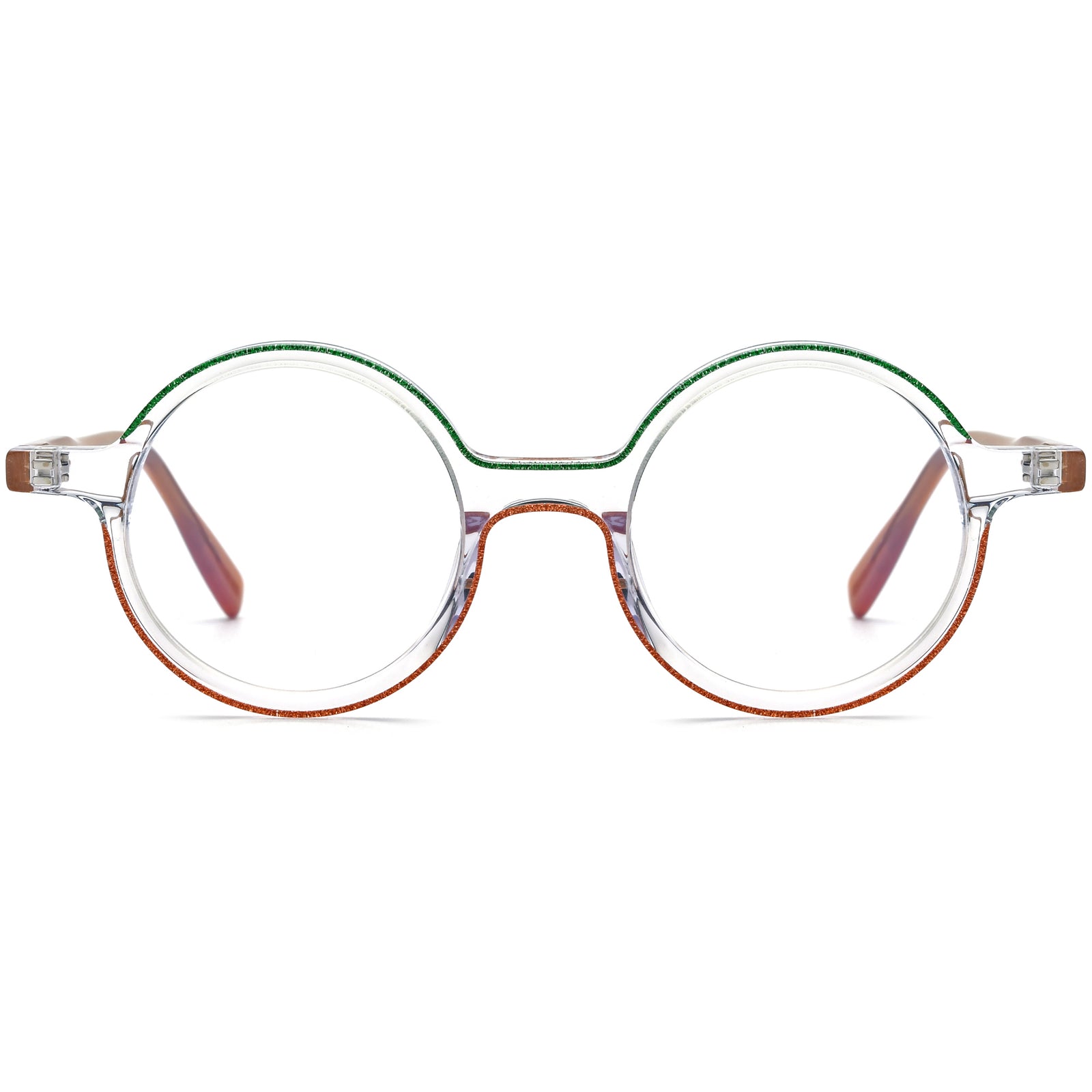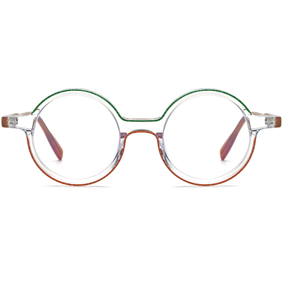Step into the spotlight with these blinged-out round glasses, designed with a vintage rounded lens shape and a full-rim acetate frame polished to perfection. Dual-tone glittering accents along the front rims create a bold and sparkling effect, while colorful temple arms add a touch of sophistication. Lightweight and comfortable, the adjustable nose pads ensure a perfect fit for extended wear. Choose from various and vibrant transparent colorways to express your unique style.