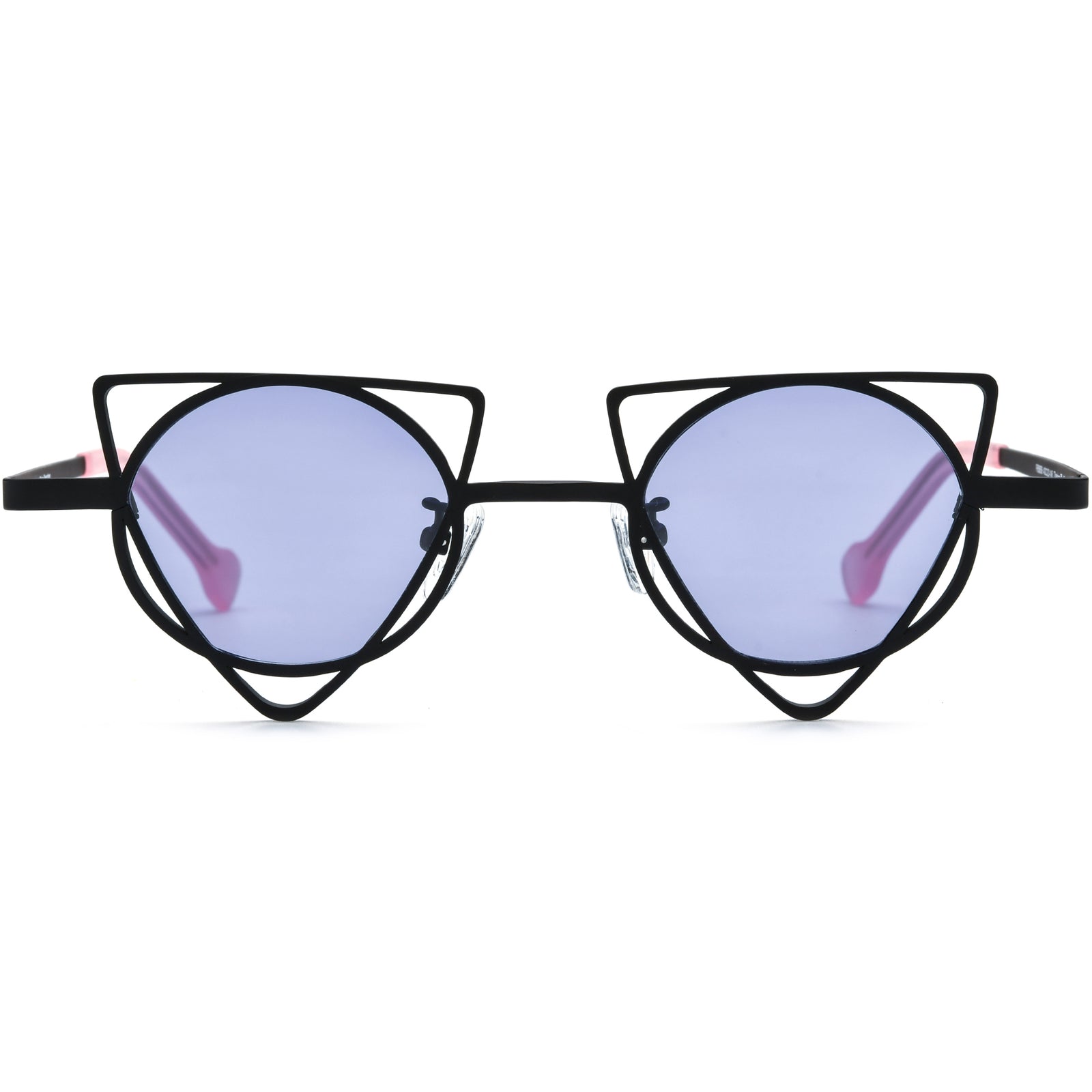 These playful, cat-inspired sunglasses feature a double-layered geometric frame with a unique cut-out cat ear shape around round lenses, combining whimsy with sophistication. Designed to make a bold statement, they come with tinted polarized lenses for full UV protection, making them both stylish and practical for sunny days. The lightweight construction ensures comfortable all-day wear, while pink temple tips add a vibrant pop of color. Adjustable nose pads provide a secure, customized fit, making these sunglasses ideal for those who embrace creativity and individuality in their accessories.