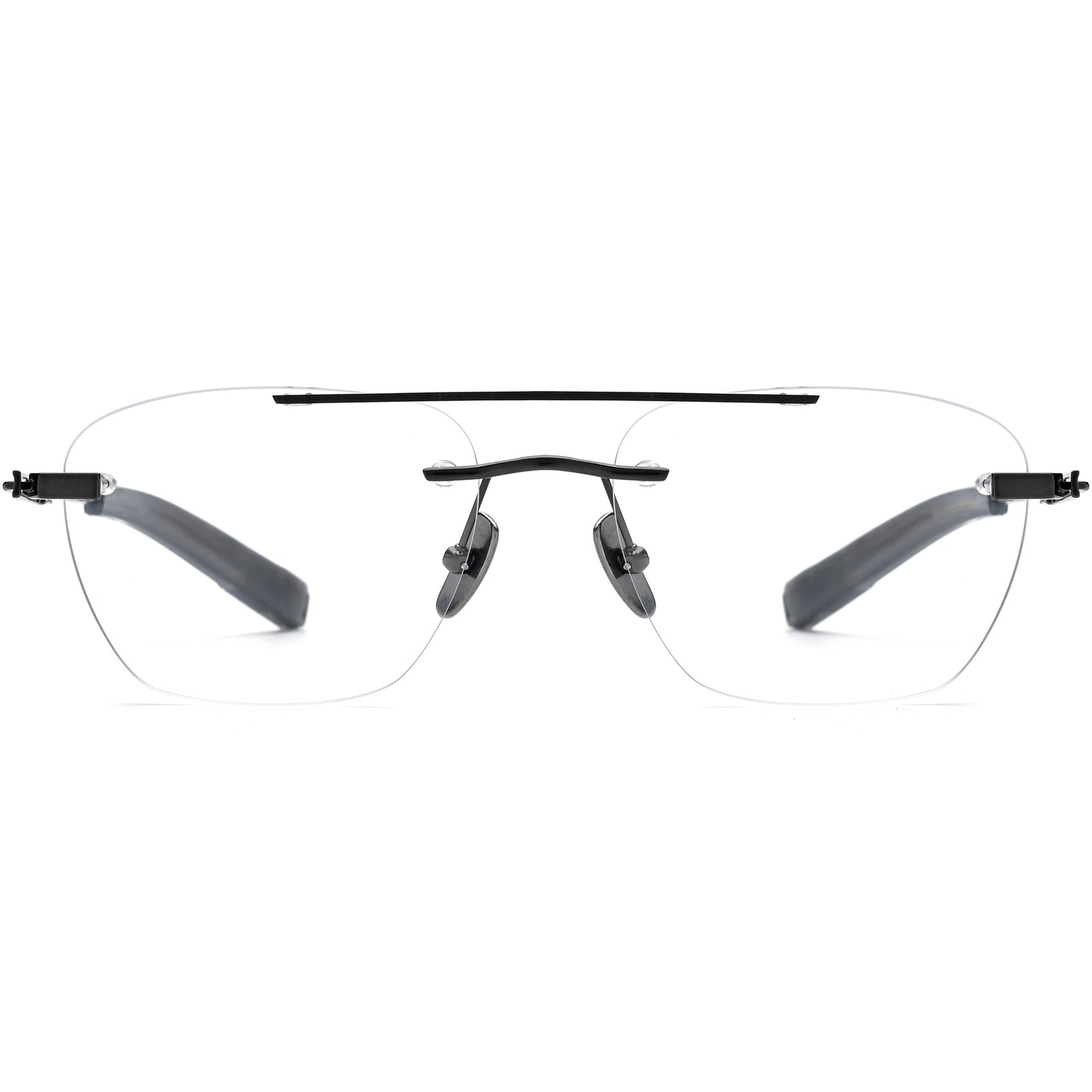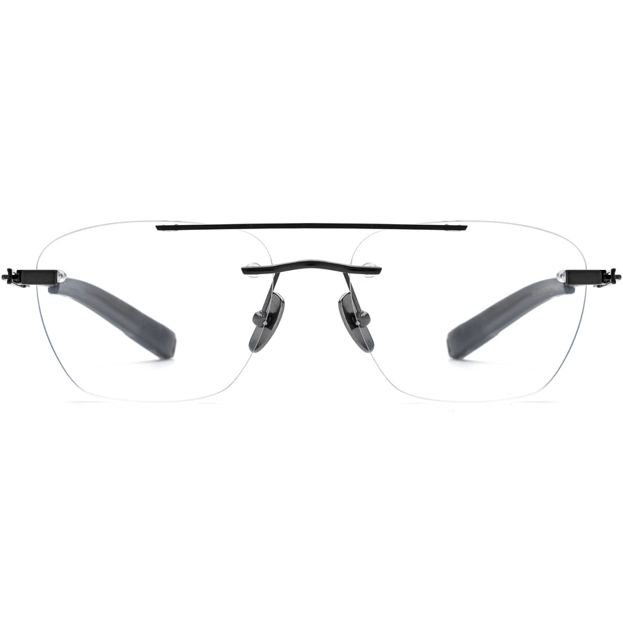 These large titanium aviator glasses boast a modern rimless design, accentuated by a sleek, straight metallic brow bar. The ultra-thin bridge and temple arms provide an effortlessly lightweight look, complemented by a titanium bridge and comfortable adjustable nose pads. The acetate temple tips offer a touch of contrast and added comfort. With a uniquely designed hinge part, these aviators blend sophistication and a cutting-edge look, making them perfect for those seeking a bold yet refined eyewear choice.