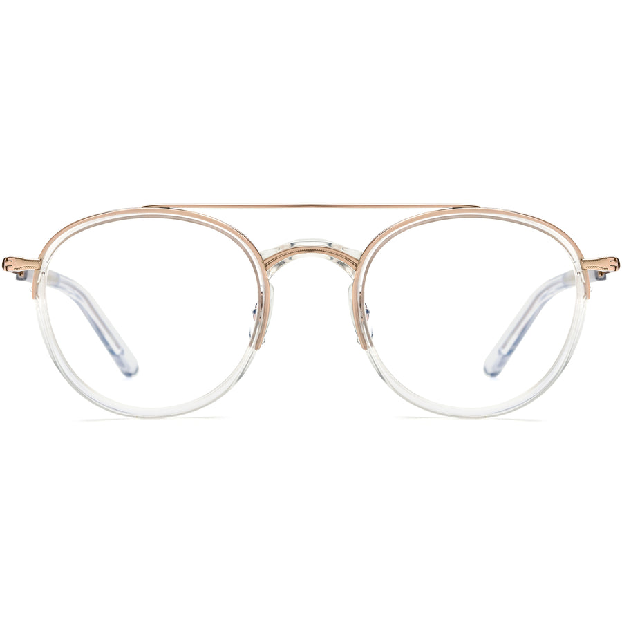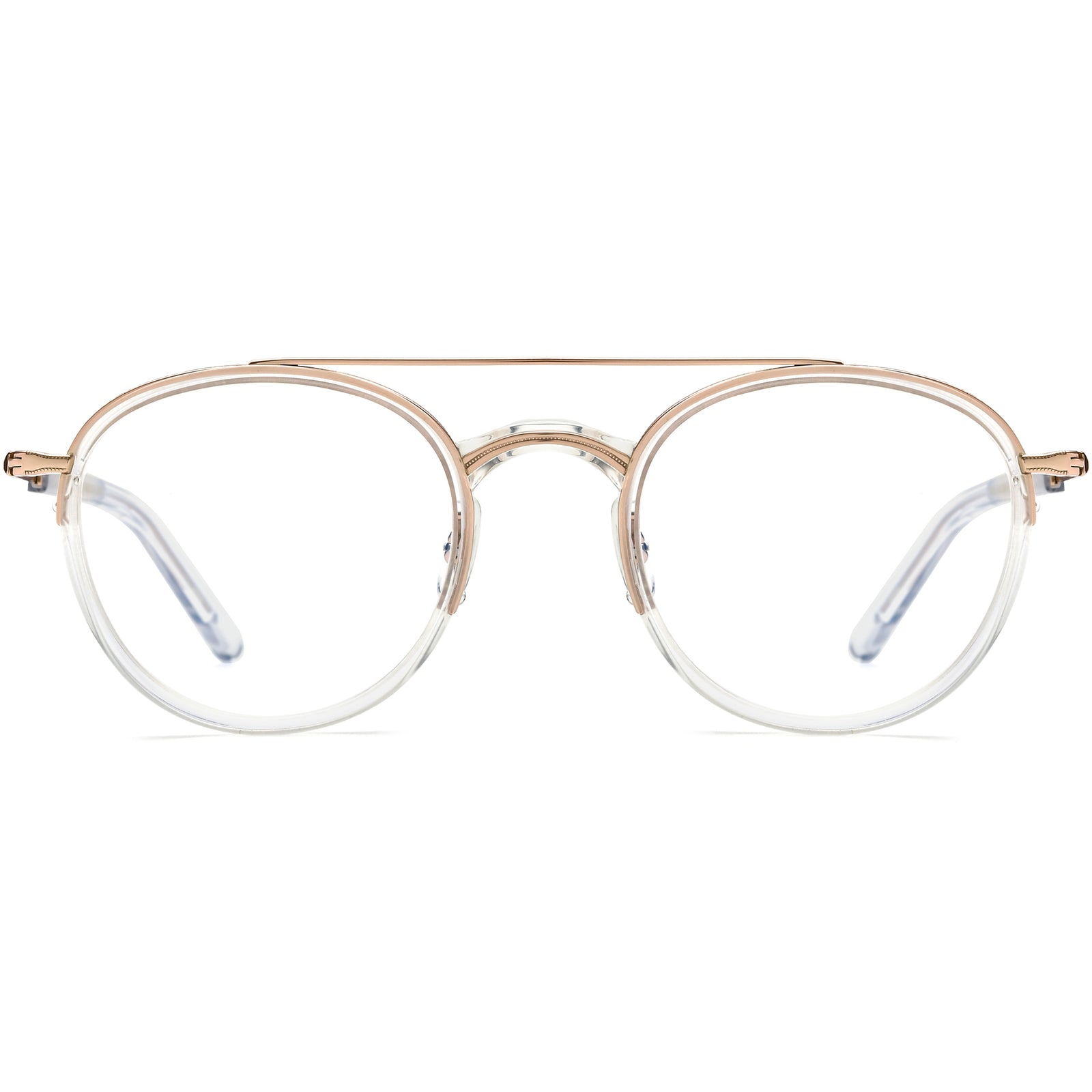 These vintage aviator glasses are the perfect combination of style and comfort. They feature a round lens shape, with transparent acetate rims paired elegantly with metallic upper front rims. Slim temple arms provide a modern touch, while adjustable nose pads ensure a customized, comfortable fit. The blend of classic round frames and modern transparent elements creates an effortlessly stylish look, ideal for those with square or diamond face shapes, adding a vintage vibe to everyday wear.