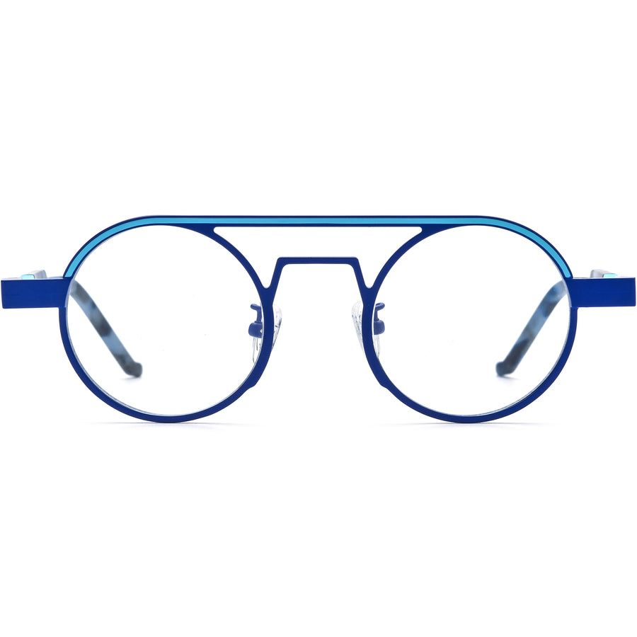 Add an avant-garde twist to your eyewear with these geometric round-aviator eyeglass frames. Crafted from lightweight titanium, they feature a bold top-bar design, sculpted double bridge, and precision cut temples for a futuristic edge. Available in striking colorways like cobalt blue, neon green, and black-white contrast, these glasses balance artistic flair with everyday comfort. Adjustable nose pads and slim temples ensure a secure fit, while the statement silhouette flatters round, oval, and heart-shaped faces.