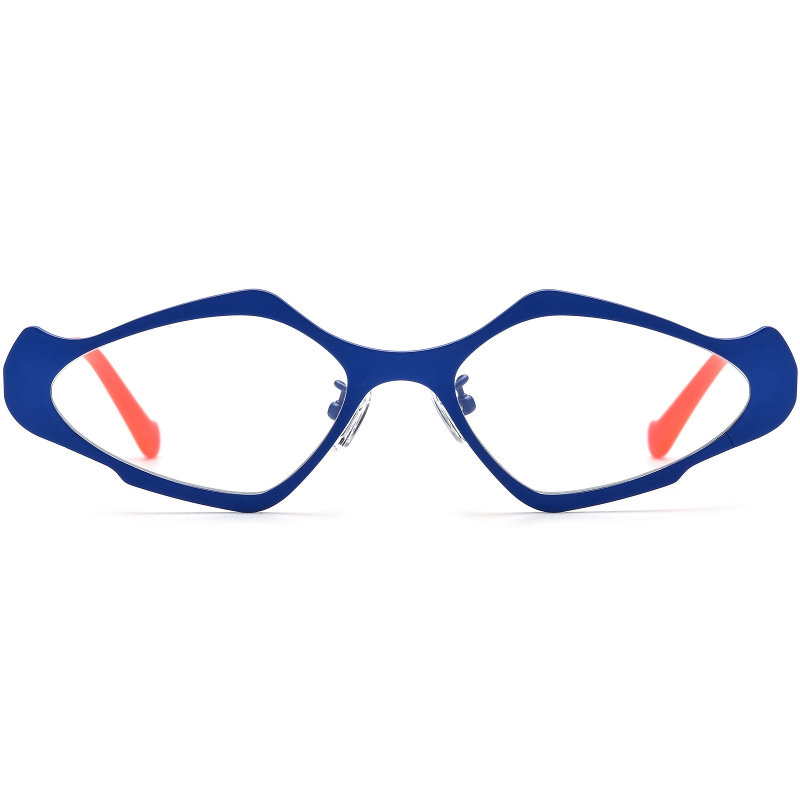 These titanium eyeglasses feature a bold cat-eye shape with a full-rim design, crafted to make a statement. The front rim is adorned with sleek, contrasting color accents that add a dynamic, modern touch. The frame’s clean lines and subtle curvature create a sharp, yet approachable look, perfect for a variety of face shapes. Designed for comfort, these glasses offer an adjustable nose pad for a secure fit, blending style and functionality seamlessly for everyday wear.