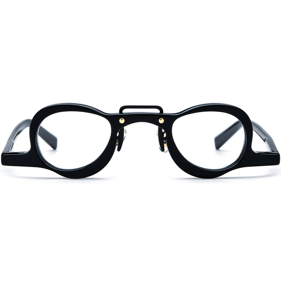 This frame is crafted with high-gloss acetate, creating a bold and individualized geometric design. A double bridge feature adds a unique touch, with a metallic bridge elegantly fastened to the acetate bridge. The temples connect to the frame at a lowered hinge point, diverging from the typical mid-height connection—an uncommon placement that emphasizes the rounded design and enhances the ergonomic fit for the wearer. The frame showcases a distinctive oval silhouett, perfectly blending a modern geometric aesthetic with classic elements.
