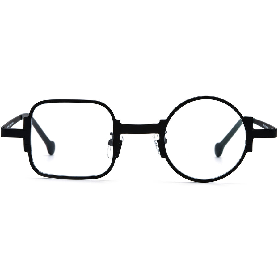 These geometric glasses feature a playful asymmetrical design with square and round lenses, crafted from lightweight and durable titanium for all-day comfort. Bold, fluorescent colors add a vibrant touch to the chic style, while slim rims maintain a sleek, modern look. The contrast-colored circular temple tips enhance the design’s fun and unique appeal. Adjustable nose pads provide a customized and secure fit, making these frames both stylish and comfortable—a perfect choice for those who appreciate bold, standout eyewear.