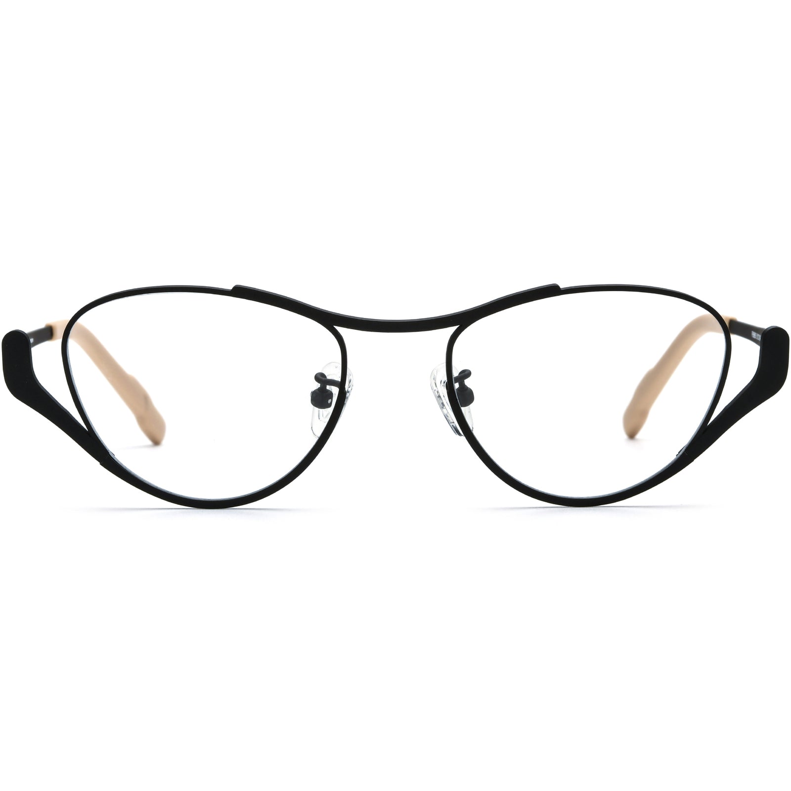 These full-rim geometric glasses are crafted from lightweight and durable titanium. The front rim design of these glasses features a uniquely curved, cat-eye inspired silhouette that gives a modern twist to a classic look. The temple tips are crafted with an ergonomic, sculpted shape that not only adds a stylish touch with its contrasting color but also ensures enhanced comfort and grip behind the ears. The bridge of these glasses features a sleek, elevated design that adds a subtle yet sophisticated touch. They ensure enhanced comfort and an exact fit with adjustable nose pads.