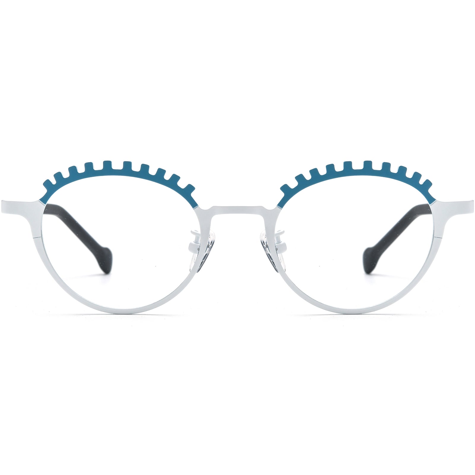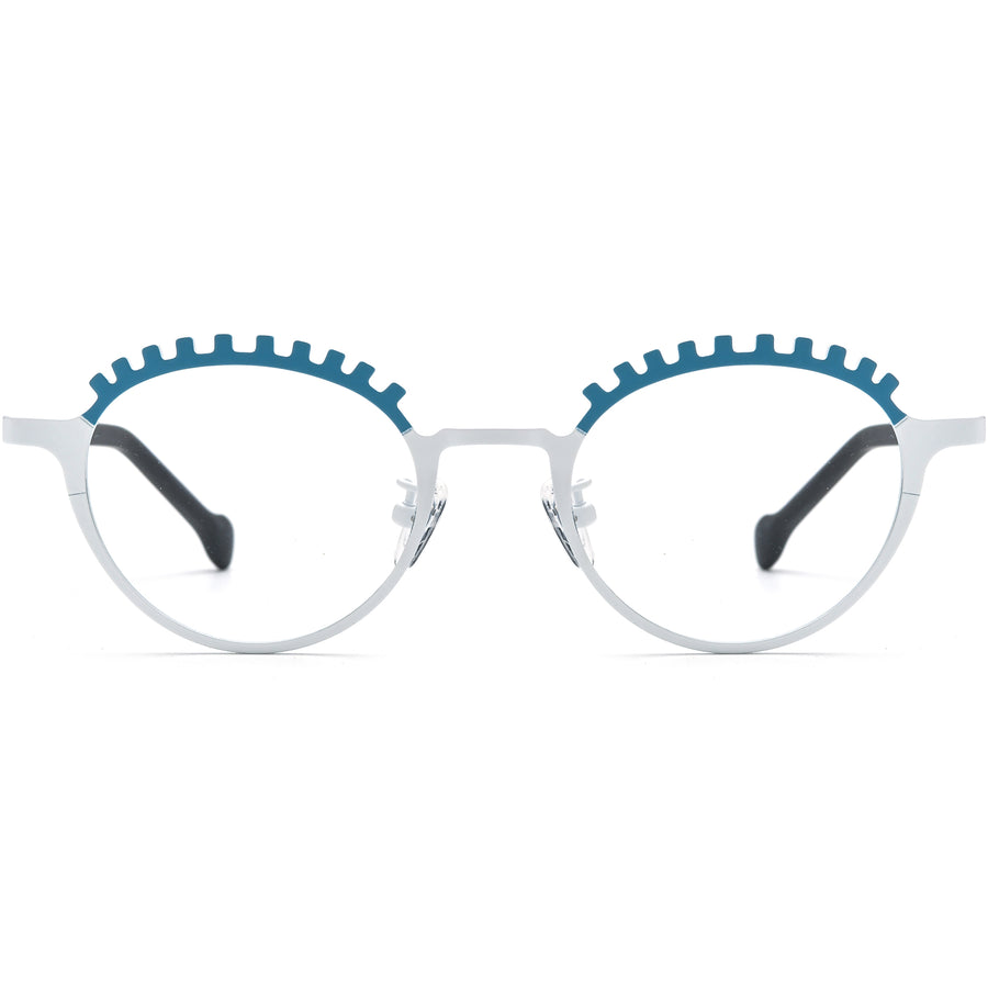 These geometric titanium glasses feature a unique round lens shape and an artistic brow bar resembling playful eyelashes, adding a touch of personality to your look. Crafted with lightweight materials, they provide all-day comfort, while the adjustable nose pads ensure a secure and personalized fit. The contrast color combinations make these frames a statement accessory that stands out. Perfect for those seeking stylish eyewear with a bold, expressive design that combines fashion-forward flair with functional comfort.