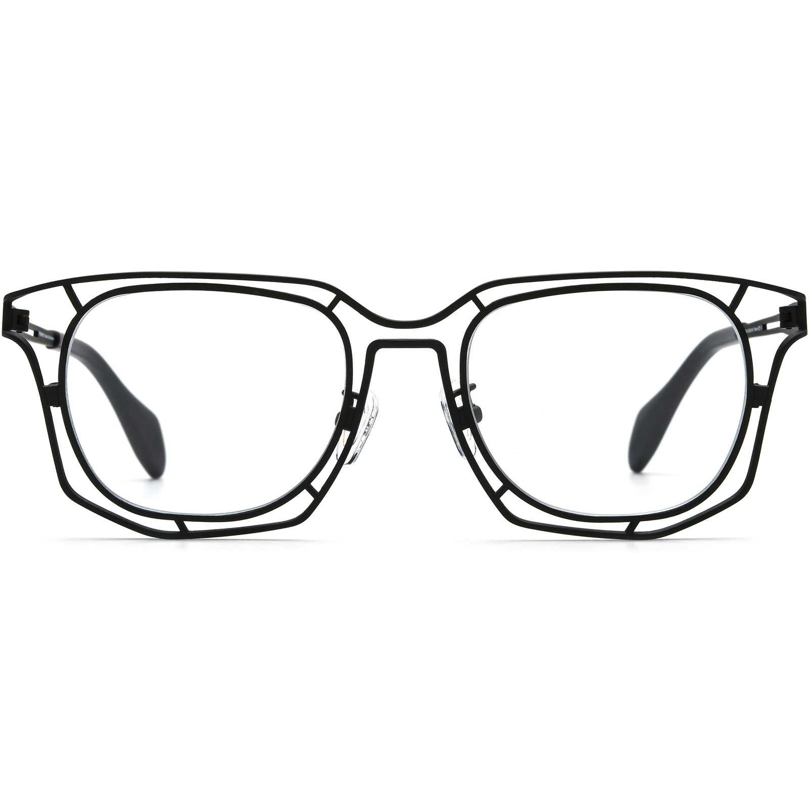 Step into bold style with these geometric full-rim eyeglass frames, designed in lightweight titanium for durability and modern edge. Featuring an artistic double-layer outline around square-round hybrid lenses, each pair offers striking architectural appeal. Available in vibrant multi-color finishes or classic black, these frames balance comfort with creativity. Adjustable nose pads and slim temples ensure an easy all-day fit. Perfect for trendsetters seeking expressive eyewear, this collection flatters oval, round, and heart-shaped faces with statement-making confidence.