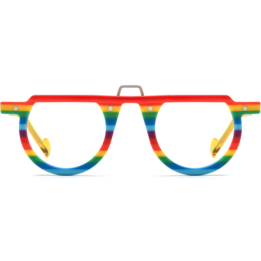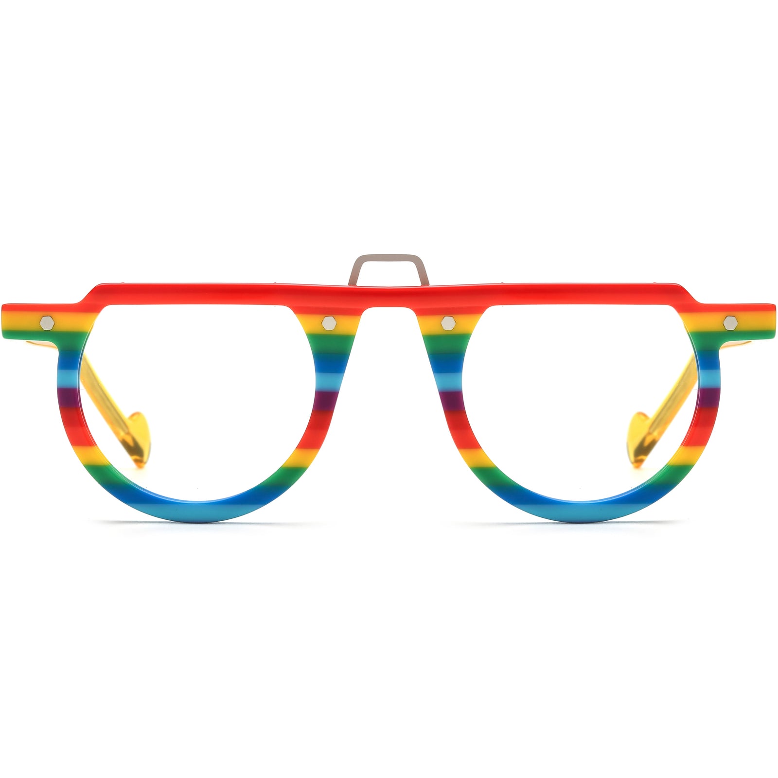 Celebrate individuality with our vibrant aviator-inspired eyeglass frames, crafted in premium acetate for durability and comfort. Featuring oversized round lenses set within a flat top bridge, these statement glasses come in striking designs—from rainbow stripes to marbled multi-colors and classic black. Comfortable nose pads and sturdy temples ensure a secure fit, while the playful palette adds personality to any look. Perfect for fashion-forward wearers seeking both comfort and standout style, these frames suit medium to wide face shapes.