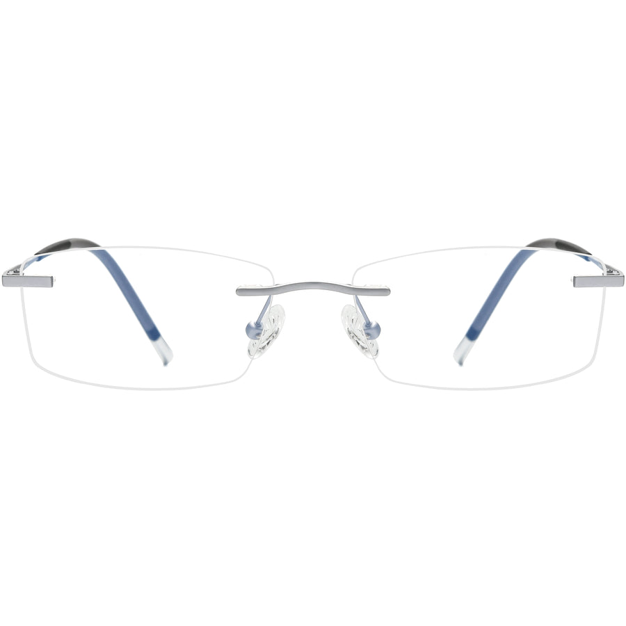 These rectangle eyeglasses feature a rimless design, combining lightweight and durable titanium for a modern, minimalist look. The sleek frame offers a clean, sophisticated style, with adjustable nose pads for a comfortable and customized fit. Available in classic colors like black, silver, and gray, these eyeglasses are perfect for those with round face shapes seeking both timeless style and everyday comfort.