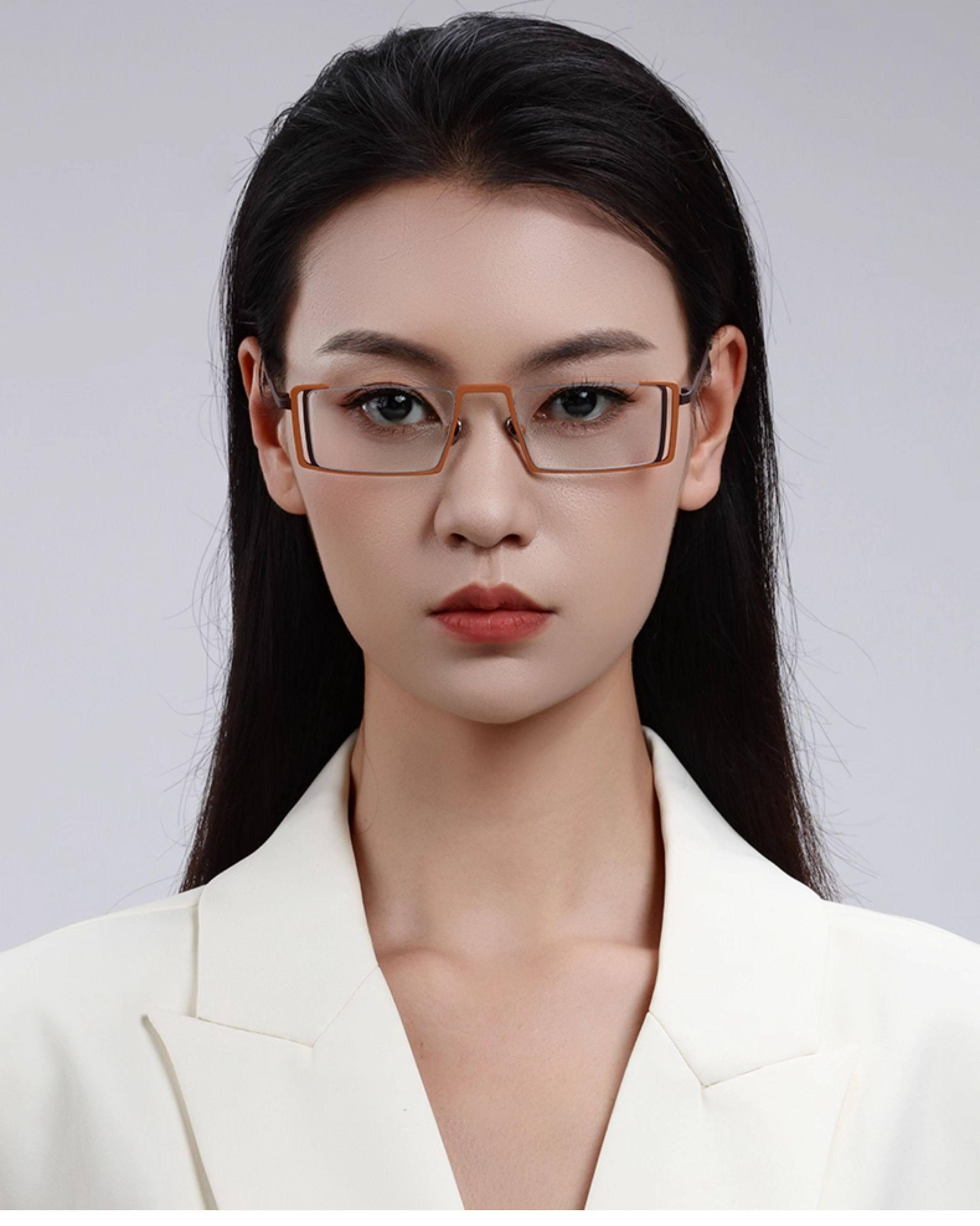 These lightweight titanium glasses feature a striking reverse half-rim design, offering a modern, minimalist aesthetic. The dual-tone rectangle frame adds a dynamic contrast, while the cut-out details at the front rims bring a distinctive edge to the look. The unique bridge design and titanium nose pads ensure a secure, adjustable fit for all-day comfort. Perfect for softening round face shapes, these glasses are available in bold color options of blue, orange, and gray, making them a stylish and functional choice for everyday wear.