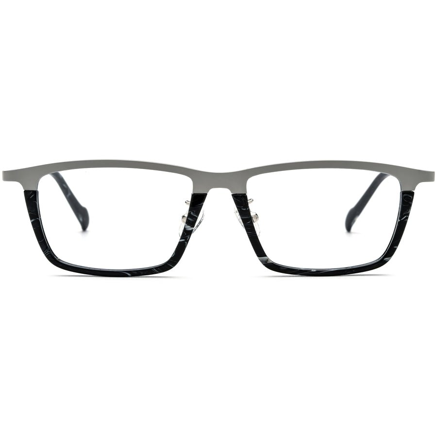 These full-rim rectangle glasses combine personality and sophistication with a unique two-tone design. The upper front rim is crafted from premium titanium, while the lower rims are made from acetate, showcasing marbled and tortoiseshell patterns that perfectly match the temple tips. The mixed materials create a bold and stylish contrast, while the adjustable nose pads ensure a snug and customized fit. Lightweight and comfortable, these glasses are ideal for those who want a standout look with all-day wearability.