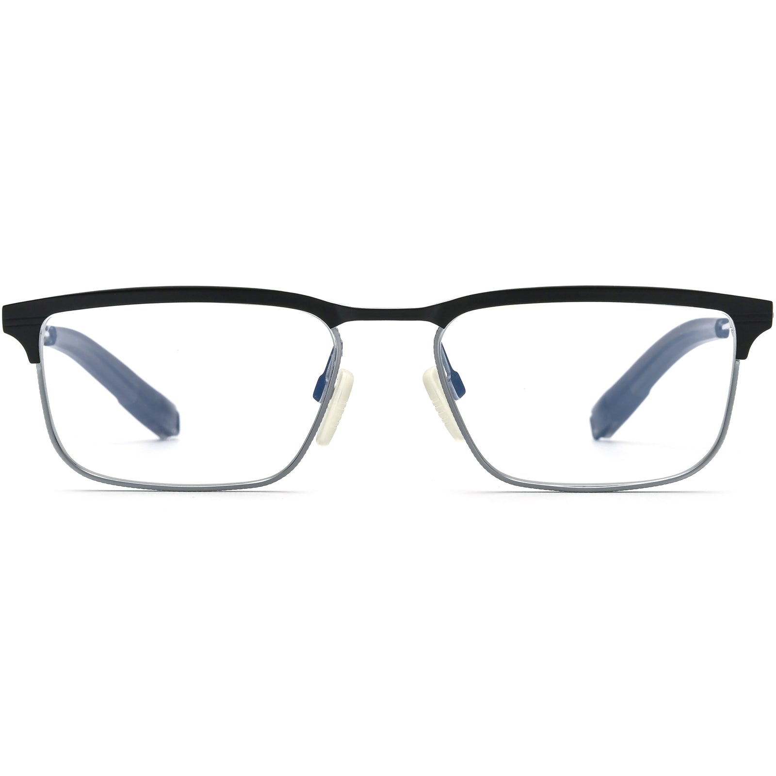 These wide rectangle glasses feature a classic browline design with metallic rims that provide a vintage and modern look simultaneously. The metallic upper front rims add a sleek, polished element, while the slim temple arms maintain a lightweight and comfortable fit. Adjustable nose pads ensure a secure fit, making these glasses a versatile and comfortable option for everyday wear. The combination of materials and colors offers a refined and stylish aesthetic, perfect for those seeking a unique eyewear experience.