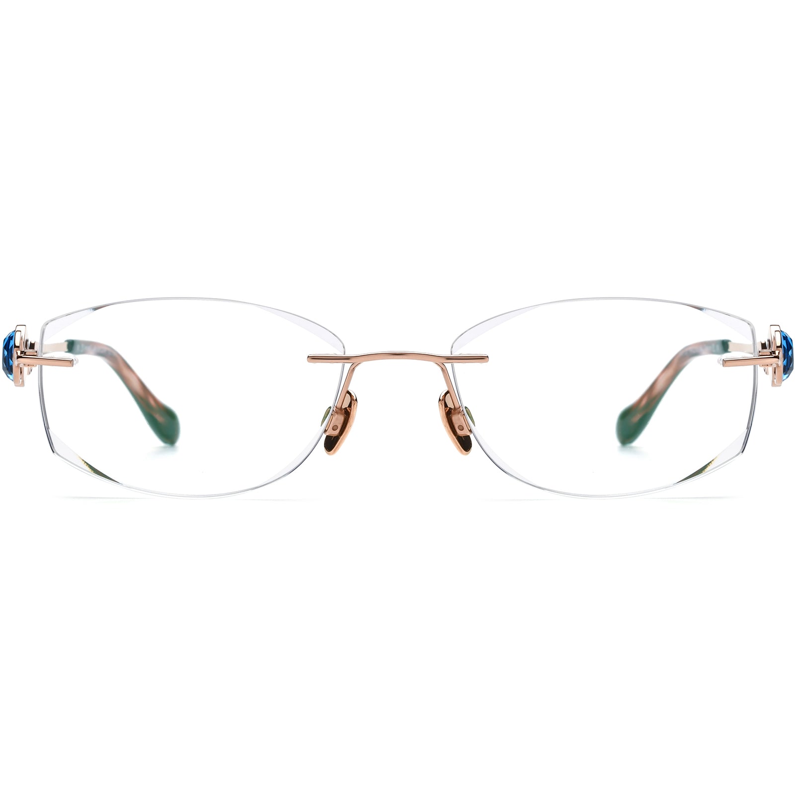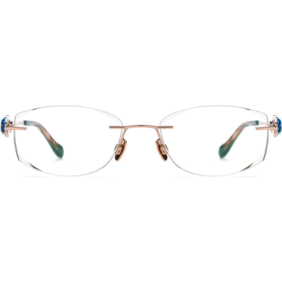 Elevate your eyewear with these elegant rimless glasses featuring rose-gold titanium detailing and artistic temples. Adorned with a sparkling blue jewel set in delicate scrollwork, the slim red arms add a touch of luxury and sophistication. Lightweight construction ensures all-day comfort, while adjustable titanium nose pads provide a secure fit. Perfect for women seeking a refined, fashion-forward look, these frames blend modern minimalism with timeless glamour. Ideal for round, oval, or heart-shaped faces.