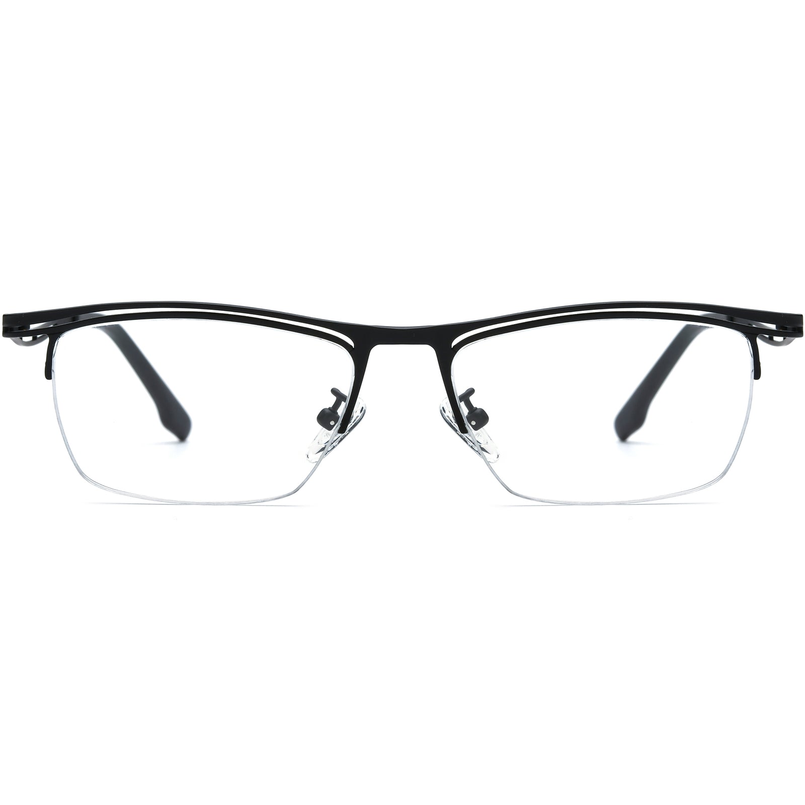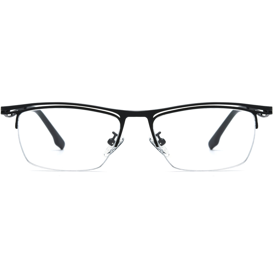 Elevate your everyday style with these modern half-rim eyeglass frames, crafted in lightweight titanium for durability and comfort. The sleek rectangular design is enhanced by cut-out temples and adjustable nose pads, offering a secure fit for long wear. Available in classic black, refined silver, bold blue, or statement multicolor finishes, these frames combine minimalism with a contemporary twist. Perfect for square, oval, and heart-shaped faces, they deliver professional elegance with all-day comfort and versatility.