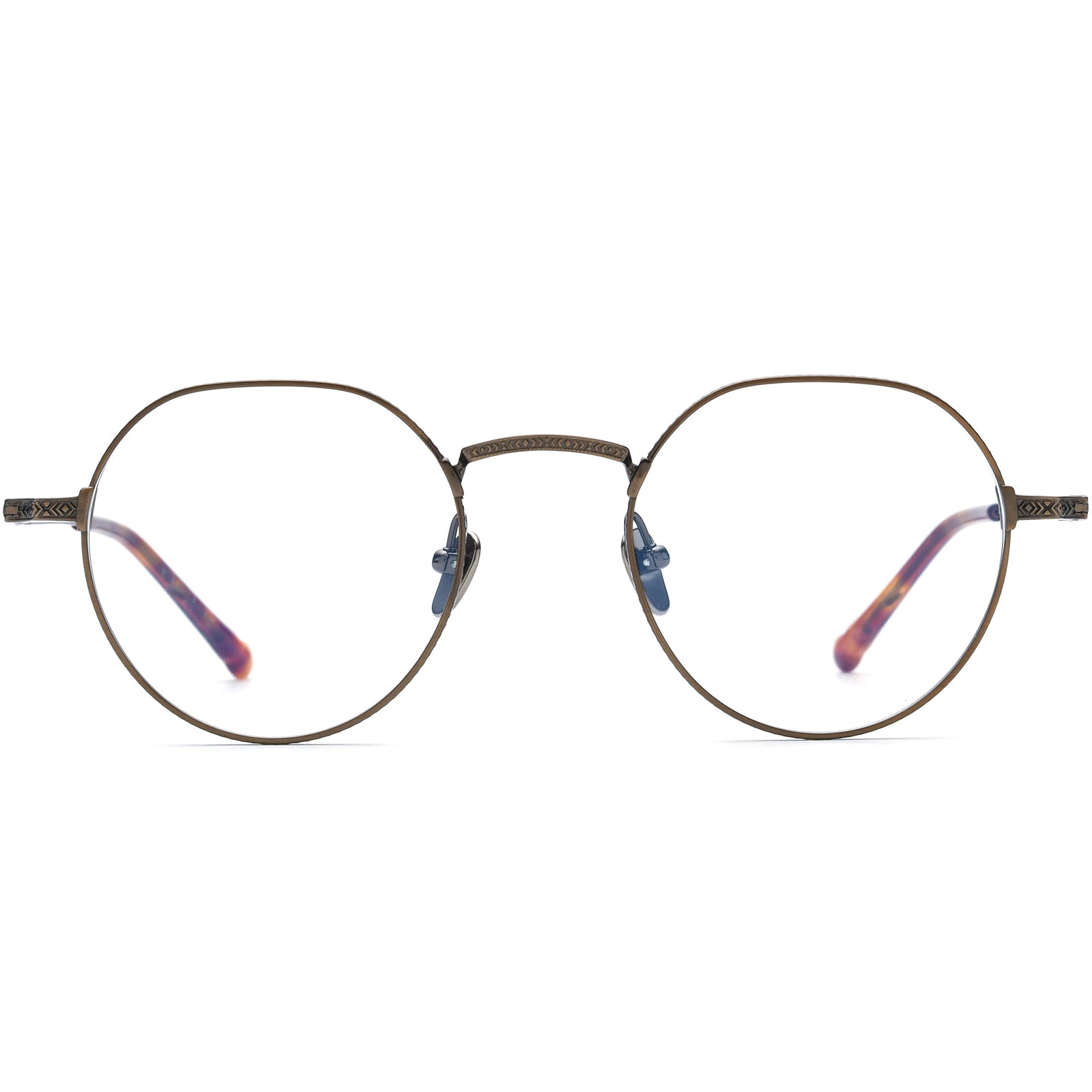 These round eyeglasses are a perfect blend of vintage charm and modern sophistication. Crafted from high-quality titanium, the delicate engravings along the front rims and temples add a touch of refinement to the classic circular shape. The slim, lightweight design ensures comfort all day long, while the adjustable titanium nose pads allow for a secure and customized fit. Available in a range of classic and contemporary colors, these glasses offer timeless appeal with a subtle, intricate detail.