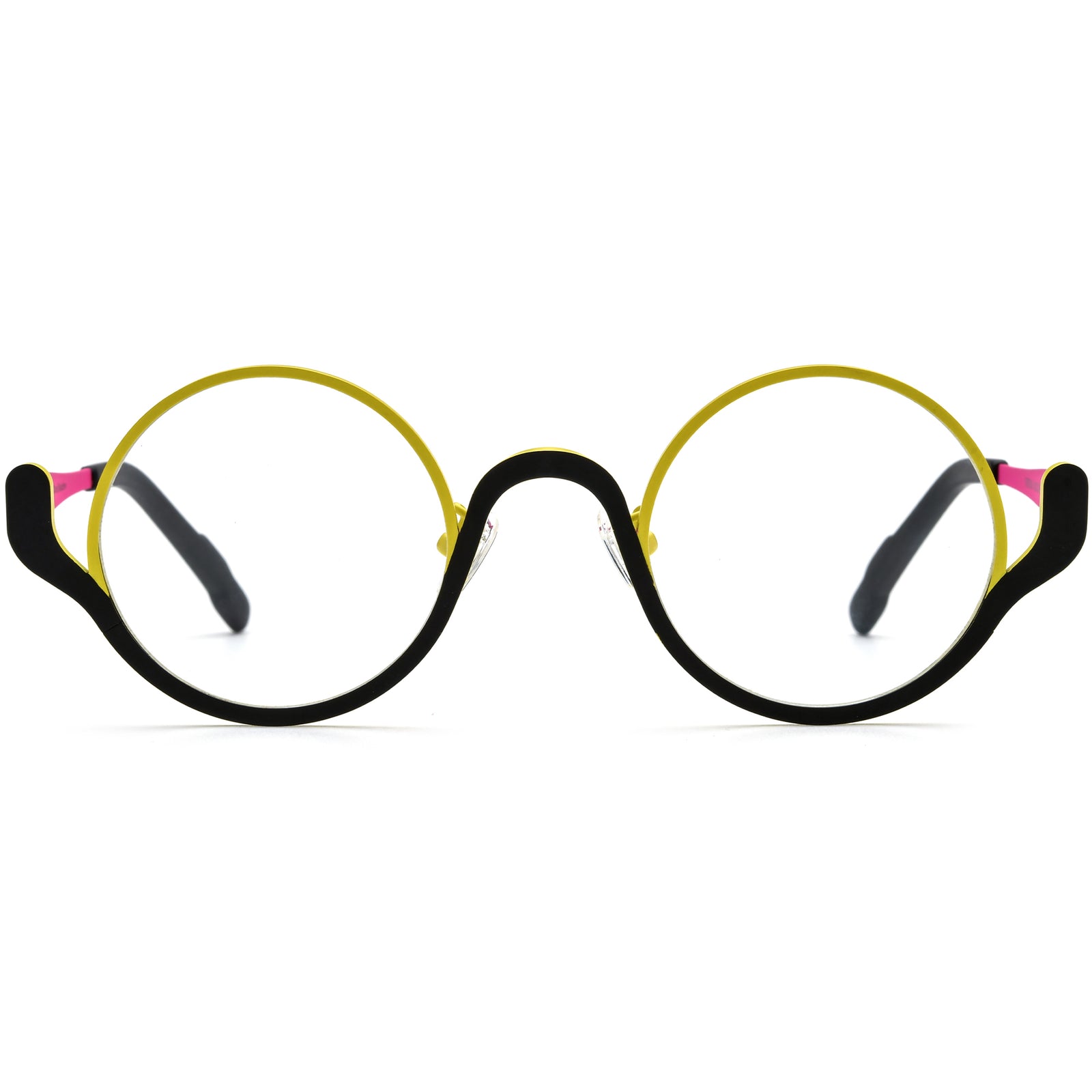These titanium eyeglasses feature a full-rim design with a distinctive geometric front rim and a bold, contrasting color palette. The unique "reversing" hinge design adds a modern twist, creating a visually dynamic effect while ensuring a secure fit. Adjustable nose pads allow for a customized, comfortable experience. With their standout style and innovative hinge, these glasses offer a perfect balance of contemporary fashion and everyday functionality, making them a must-have for those seeking a statement piece.