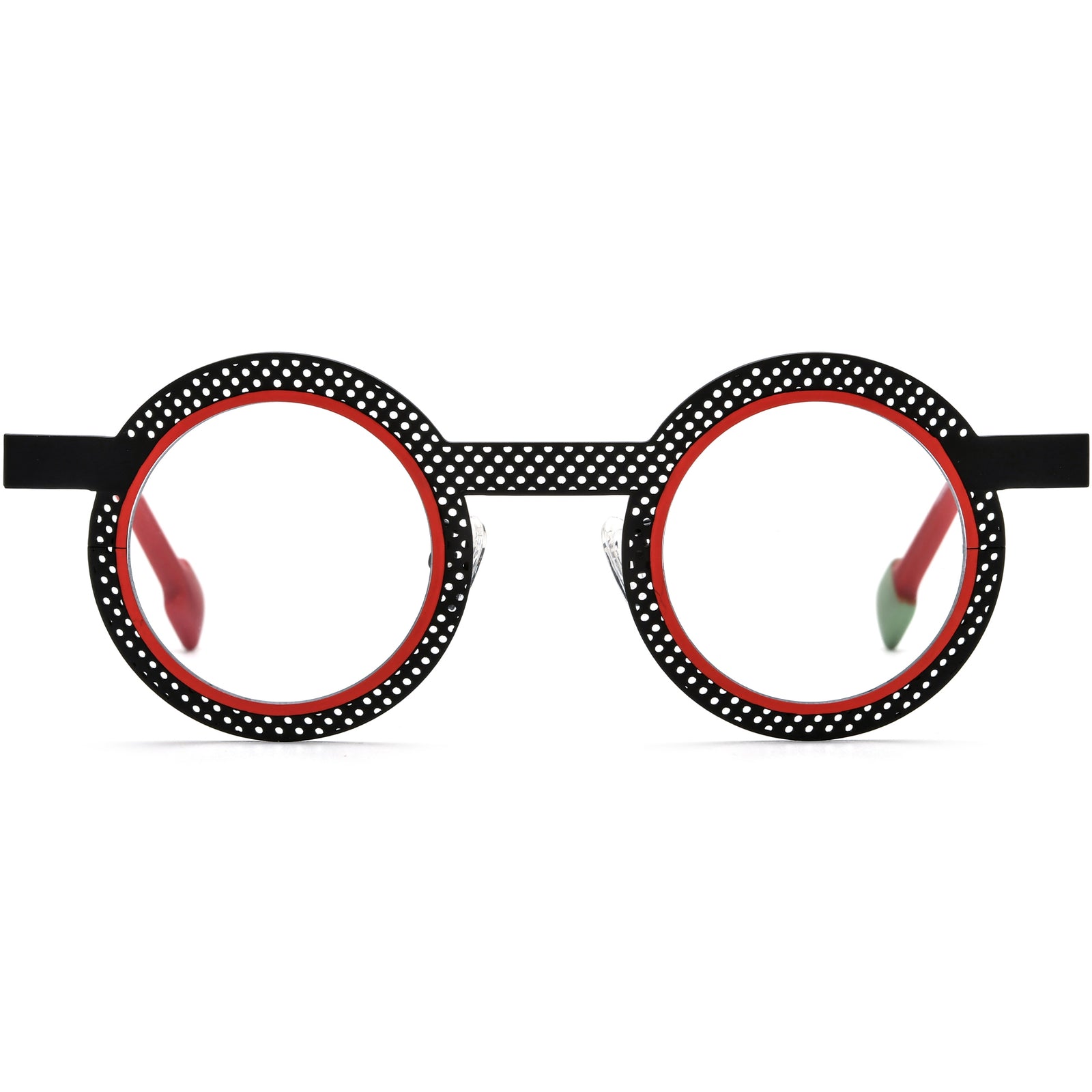 These retro round full-rim glasses are crafted from lightweight titanium, featuring a unique design with cut-out dot details along the frame. The flat bridge runs parallel to the hinge point, adding a modern, geometric touch to the overall style. Adjustable nose pads ensure a comfortable, customized fit, while the square acetate temple tips in varying colors bring a fun, dynamic element to the design. With a perfect balance of fashion and functionality, these glasses offer both style and comfort for everyday wear.