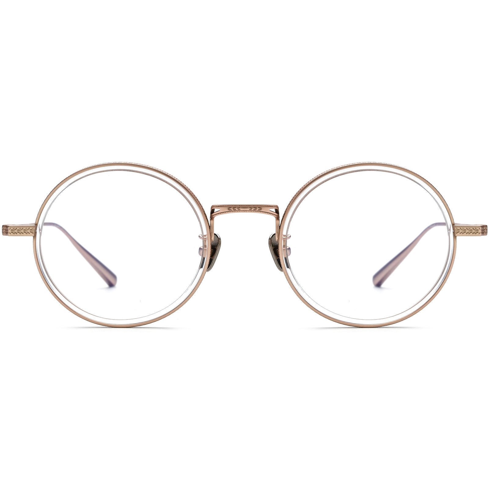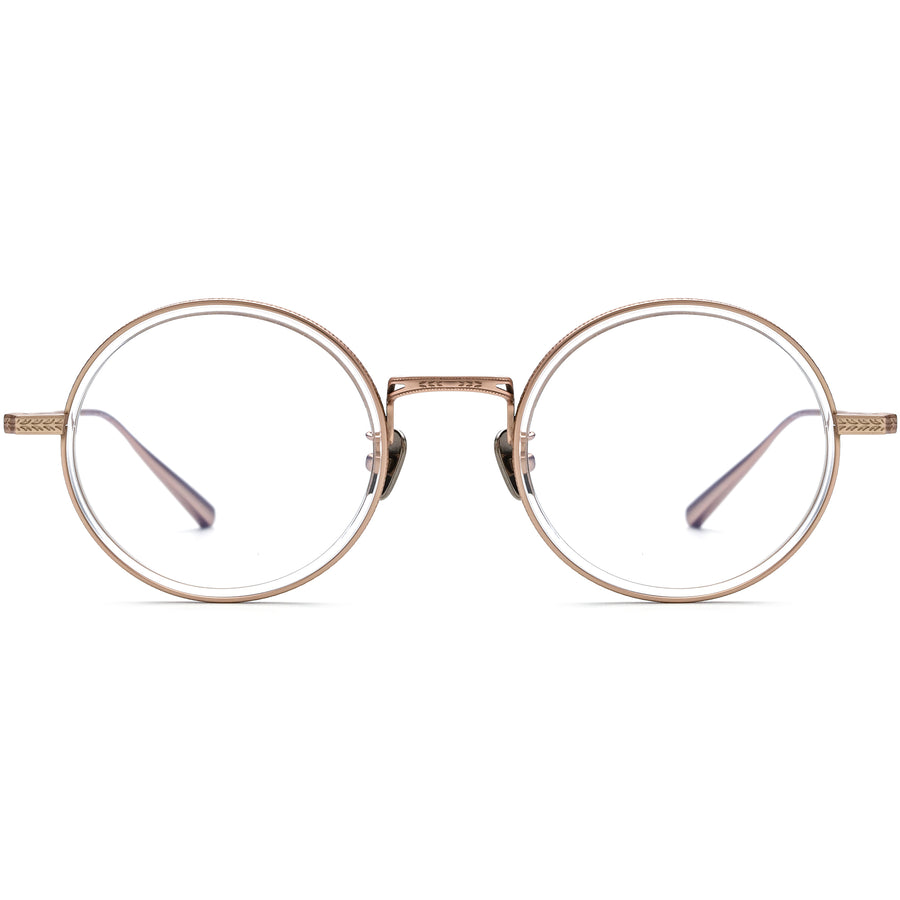 These full-rim titanium round eyeglasses showcase a vintage-inspired style, blending elegance with modern craftsmanship. The delicately engraved details on the front rims and temples exude sophistication, while the acetate inner rims paired with metal outer rims add a unique aesthetic touch. The bridge features an intricate cut-out design, enhancing the overall lightweight and comfortable fit. Equipped with titanium nose pads, these glasses are both hypoallergenic and stylish. Available in tortoiseshell, gray, clear, black, and blue, they are an ideal choice for square and diamond face shapes.