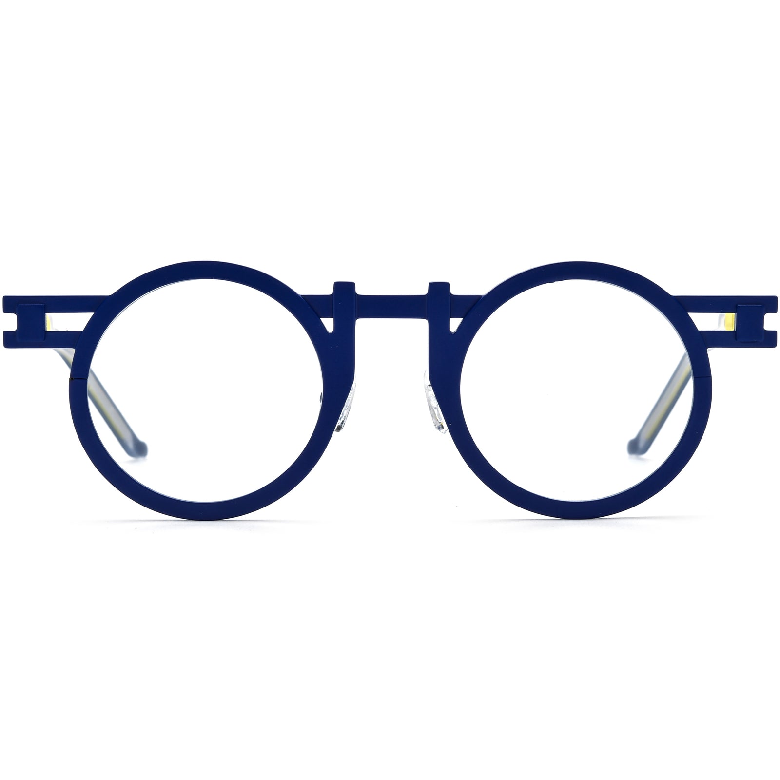 These bold round glasses make a statement with a unique architectural design, crafted from lightweight titanium that ensure comfort. The frames combine striking color pairings, such as blue and yellow or pink and red, for a vibrant look. The bold geometric temples add a distinctive edge, complemented by the round shape for an artsy, modern appeal. Available in a variety of bright colors, these glasses are perfect for those who love a playful and daring aesthetic in their eyewear. They ensure enhanced comfort and an exact fit with comfortable materials and adjustable nose pads.