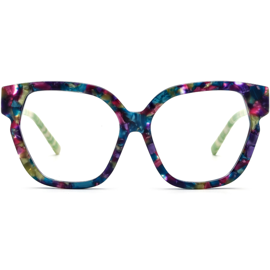 The oversized full-rim square glasses feature a subtle cat-eye lens shape, showcasing a bold and unique marbled pattern on the front rims, where contrasting tones create an eye-catching, swirled effect. The pattern blends shades of brown, cream, and darker hues, giving the frame a sophisticated yet playful look. This marbled design is complemented by the glossy finish, which highlights the intricate details. The colorful accents aling the browline add a fun pop, providing a vibrant contrast to the more neutral tones of the frame.