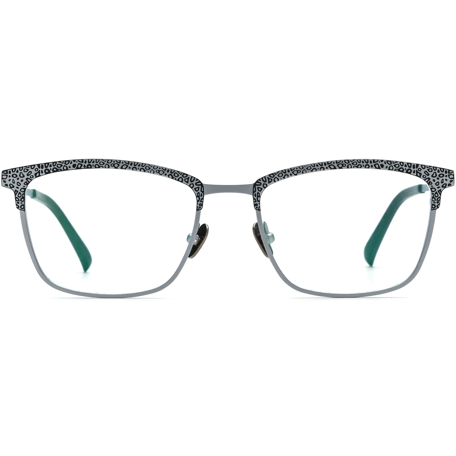 These square eyeglass frames combine sleek titanium with a bold patterned browline for a modern twist on a classic design. The lightweight construction ensures lasting comfort, while adjustable titanium nose pads and durable temples provide a secure fit for all-day wear. Available in multiple colorways including silver, black-orange, blue-green, and gold, these stylish frames add personality without sacrificing versatility. Perfect for men and women seeking statement eyewear, they flatter square, oval, and heart-shaped faces with sophisticated edge.
