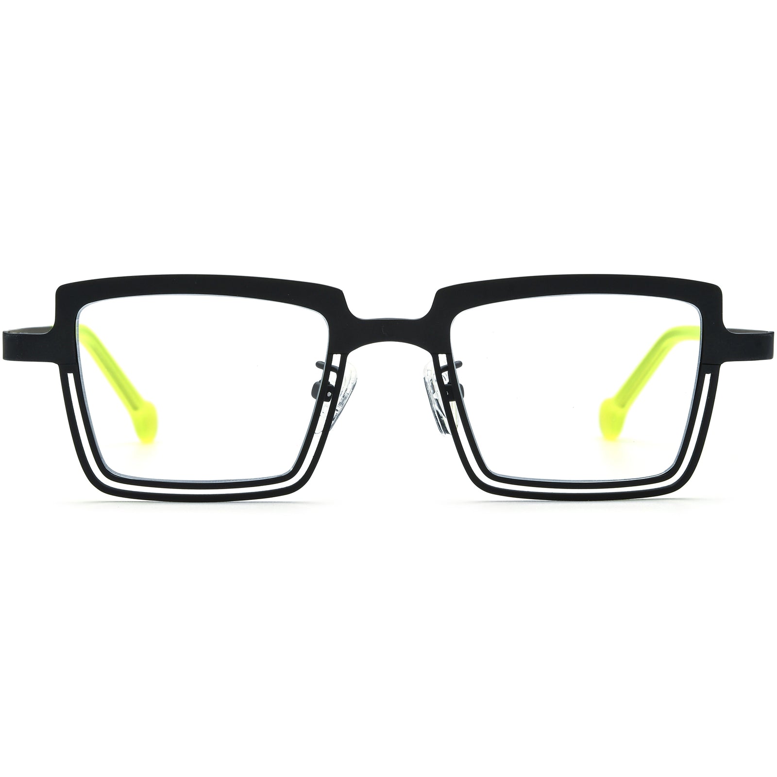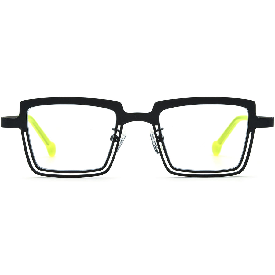 Stand out with these bold square eyeglass frames, crafted in lightweight titanium for lasting comfort and durability. Featuring a striking double-layer rim design and vibrant two-tone colors, these glasses bring a modern, architectural edge to your everyday style. Adjustable nose pads and ergonomic temple tips ensure a secure, comfortable fit all day long. Perfect for fashion-forward men and women seeking distinctive eyewear, this collection pairs statement-making design with versatility, ideal for round, oval, or heart-shaped faces.