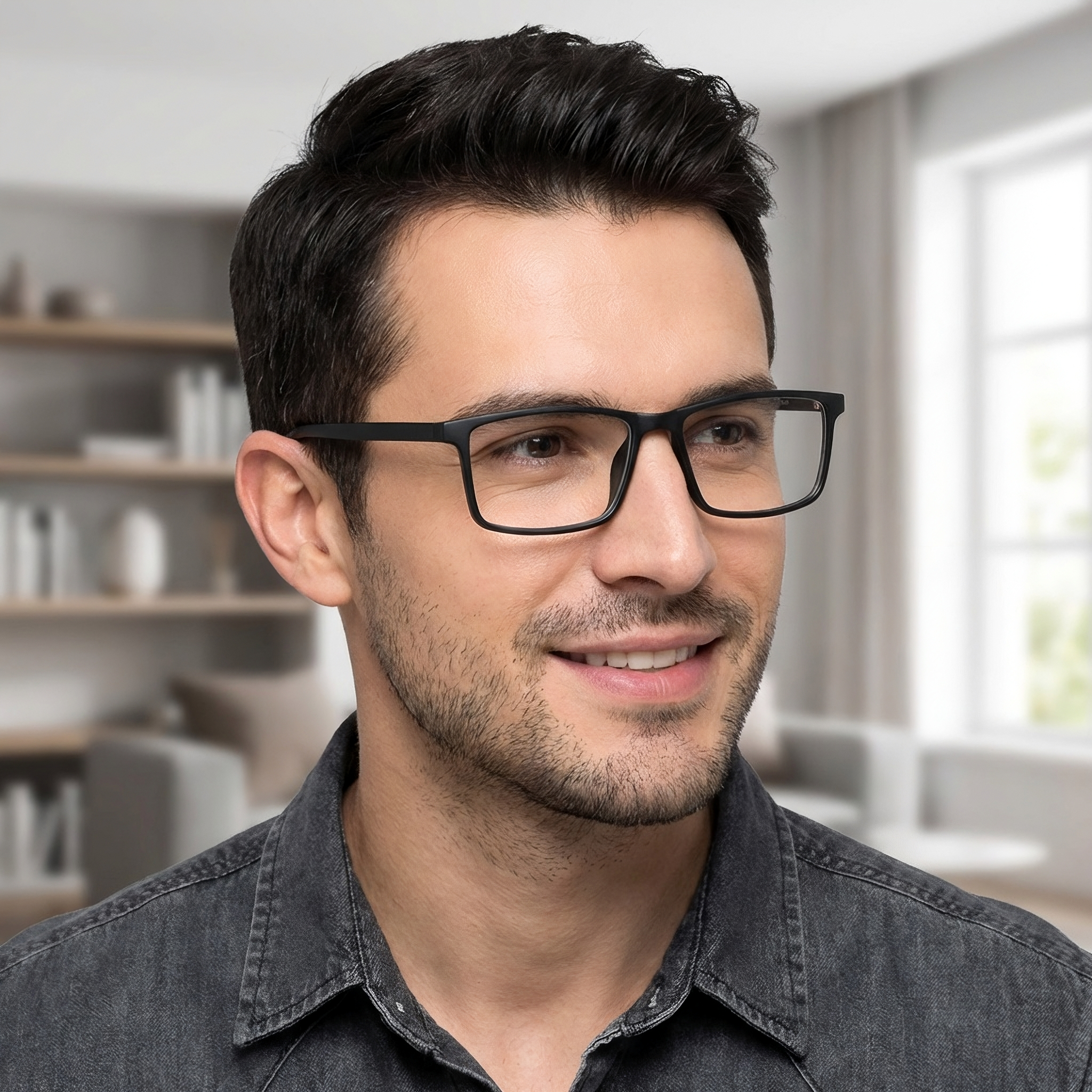Discover the perfect pair of eyeglasses crafted just for men with broader face structures. These ultra-light and flexible frames, made from premium TR90 plastic, promise unmatched comfort and durability. Boasting a thin yet very wide rectangular design, they offer a flattering fit for those with larger heads. Embrace your bold look with these innovative frames, combining modern style with effortless wear. Ideal for the discerning man seeking both fashion and function in his eyewear.