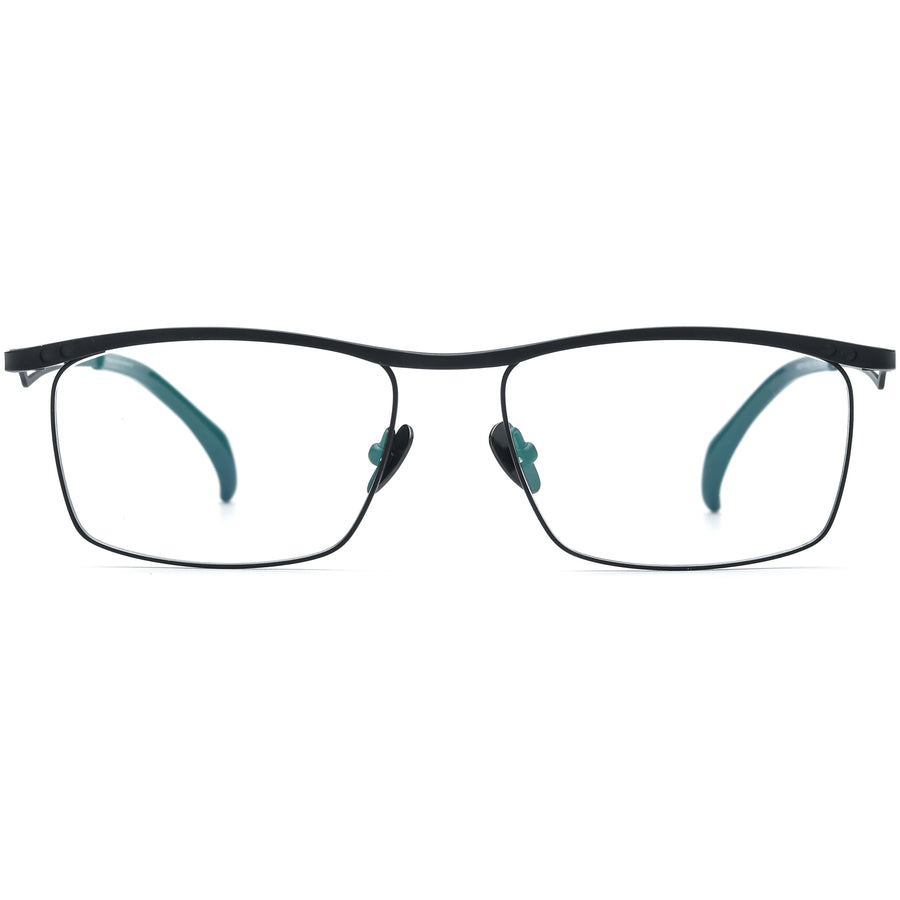 These wide rectangle glasses feature a full-rim titanium frame with magnetic clip-on sunshades, offering 100% UVA/UVB protection. Lightweight and durable, they include titanium nose pads for optimal comfort during extended wear. The sporty design boasts a unique hinge, cut-out temple arms, and anti-slip temple tips for a secure, snug fit throughout the day.