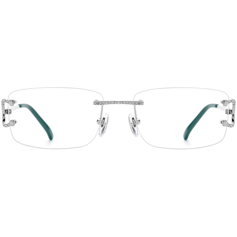 Featuring a sleek, modern aesthetic, these wide rimless glasses are designed for larger face shapes, offering a flattering, bold look. Sparkling rhinestones at the bridge and corners add a touch of elegance, making these glasses stand out with a hint of glamour. The adjustable nose pads and plastic temple tips ensure a secure, comfortable fit, while the lightweight construction guarantees all-day wearability. Ideal for everyday use, these glasses combine sophisticated style with practicality, providing both comfort and a refined, stylish appearance.