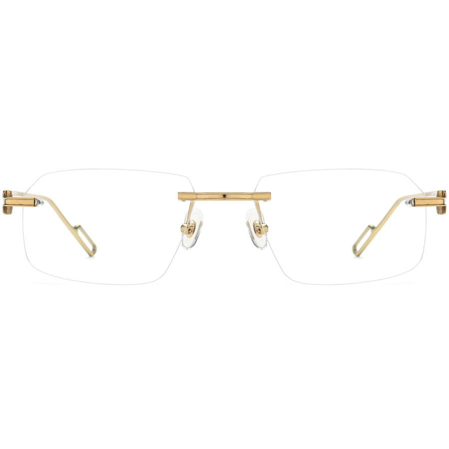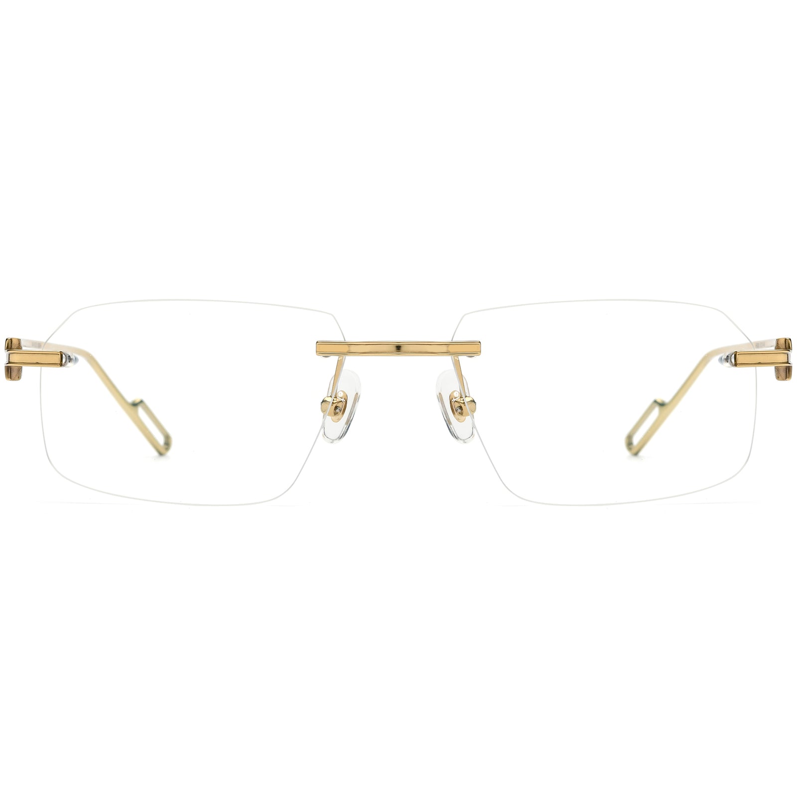 Elevate your style with these wide rectangle glasses for men, featuring an extra-large lens shape that offers both boldness and clarity. The rimless design, paired with a flat bridge, exudes modern elegance. Comfortable silicone nose pads ensure a secure fit, while the unique hinge design adds an innovative touch. Slim temple arms and looped temple tips complete the look, providing a stylish yet lightweight frame. Available in classic gold and silver, these glasses are ideal for those who value both fashion and function.