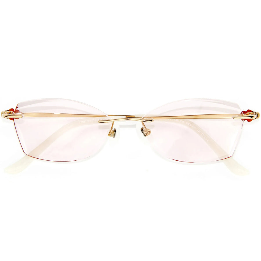 Elevate your look with these rimless geometric eyeglasses tailored for women. Constructed from high-quality titanium boasting a metallic sheen, they come equipped with an adjustable jade nose pad for tailored comfort. The temples are tastefully adorned with an exquisite jade ornament, radiating elegance. Available in soft pink, lustrous gold, and luxurious 18k gold finishes. A blend of craftsmanship and style.