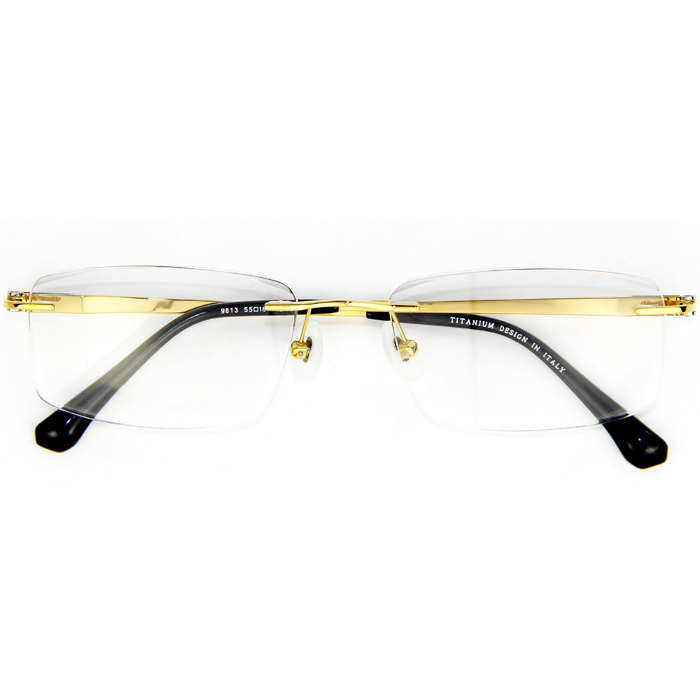 Embrace minimalist elegance with these rimless rectangular eyeglasses. Skillfully crafted from titanium, they exude a subtle metallic sheen. The design is perfected with adjustable nose pads for bespoke comfort and a refined jade ornament gracing the temple. These sophisticated frames, available in both sleek silver and opulent gold, are a harmonious blend of luxury and understated style.