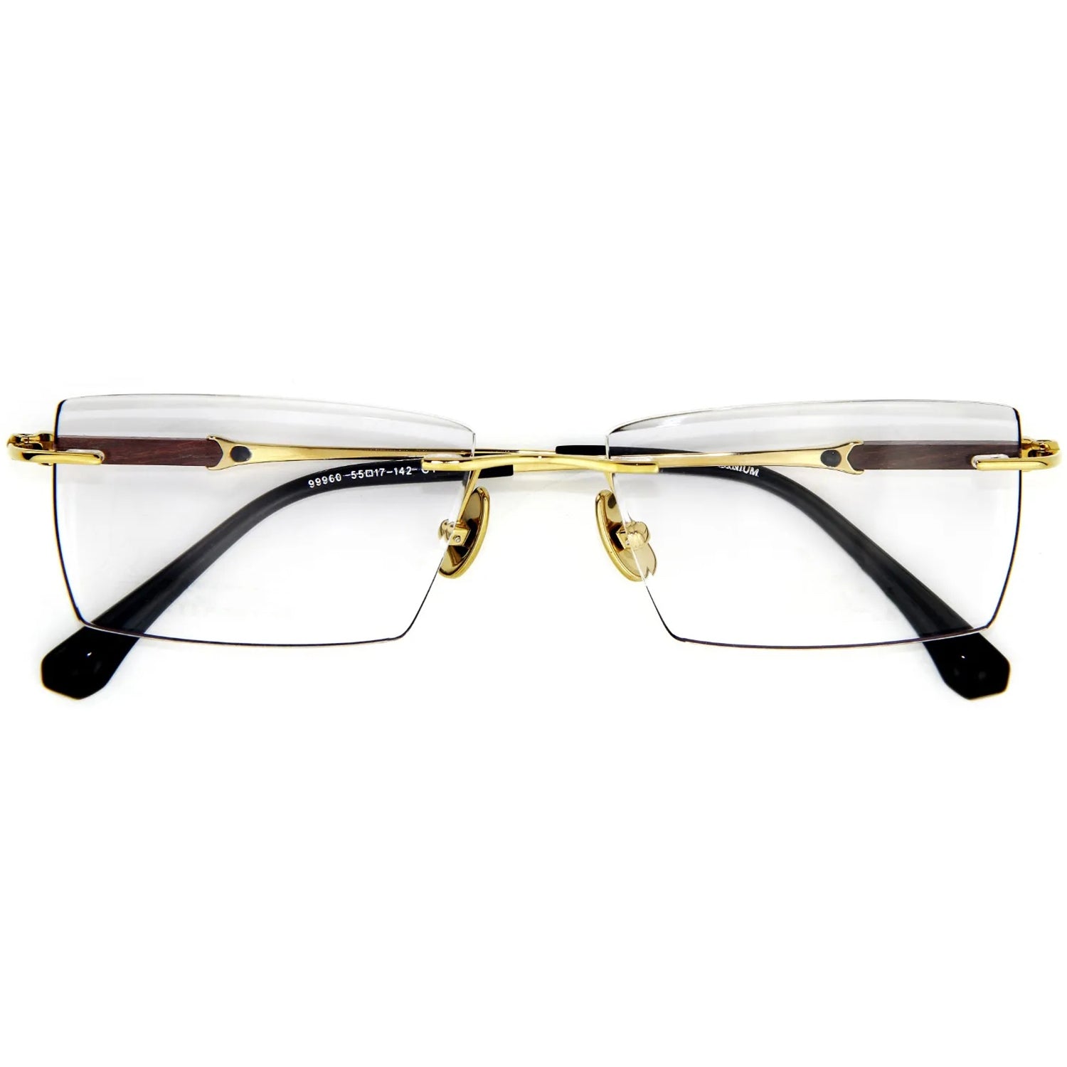 Discover sophistication in every detail with our rimless titanium eyeglasses. The metallic frames, featuring an elegant rectangle design, offer an adjustable nose pad and comfortable acetate temple tip. Adorned with a wood ornament graced by four silver dots on the temple, these glasses exude elegance. Available in gold, silver, and gray, experience high-quality craftsmanship that complements your style flawlessly.