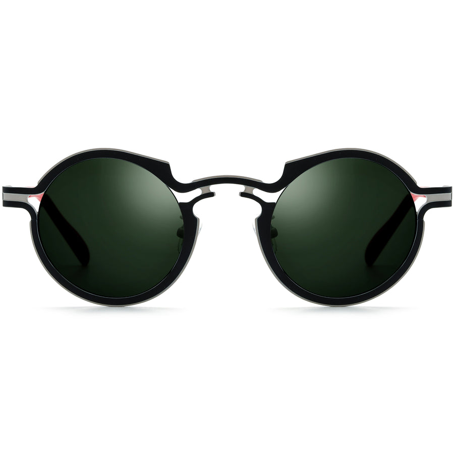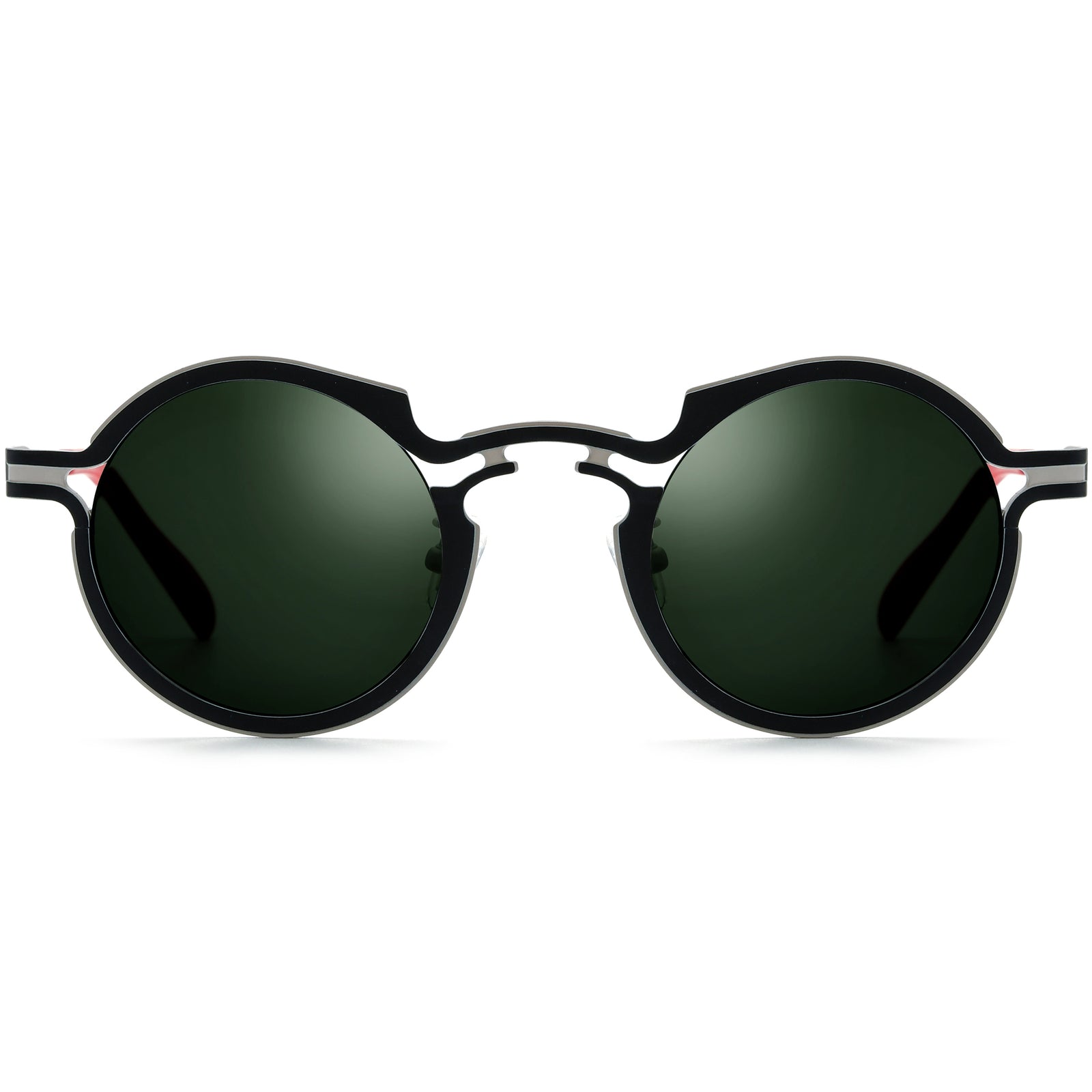 Crafted from lightweight, durable titanium, these sunglasses feature a sleek round frame with unique cutout accents for a modern, artistic flair. Perfect for everyday wear or statement occasions, the ergonomic design ensures a comfortable fit for extended use. The universal frame shape complements oval, heart, and square face shapes, adding a touch of sophistication. Designed for optimal style and comfort, these sunglasses are ideal for those seeking a versatile accessory with a bold, unique edge.