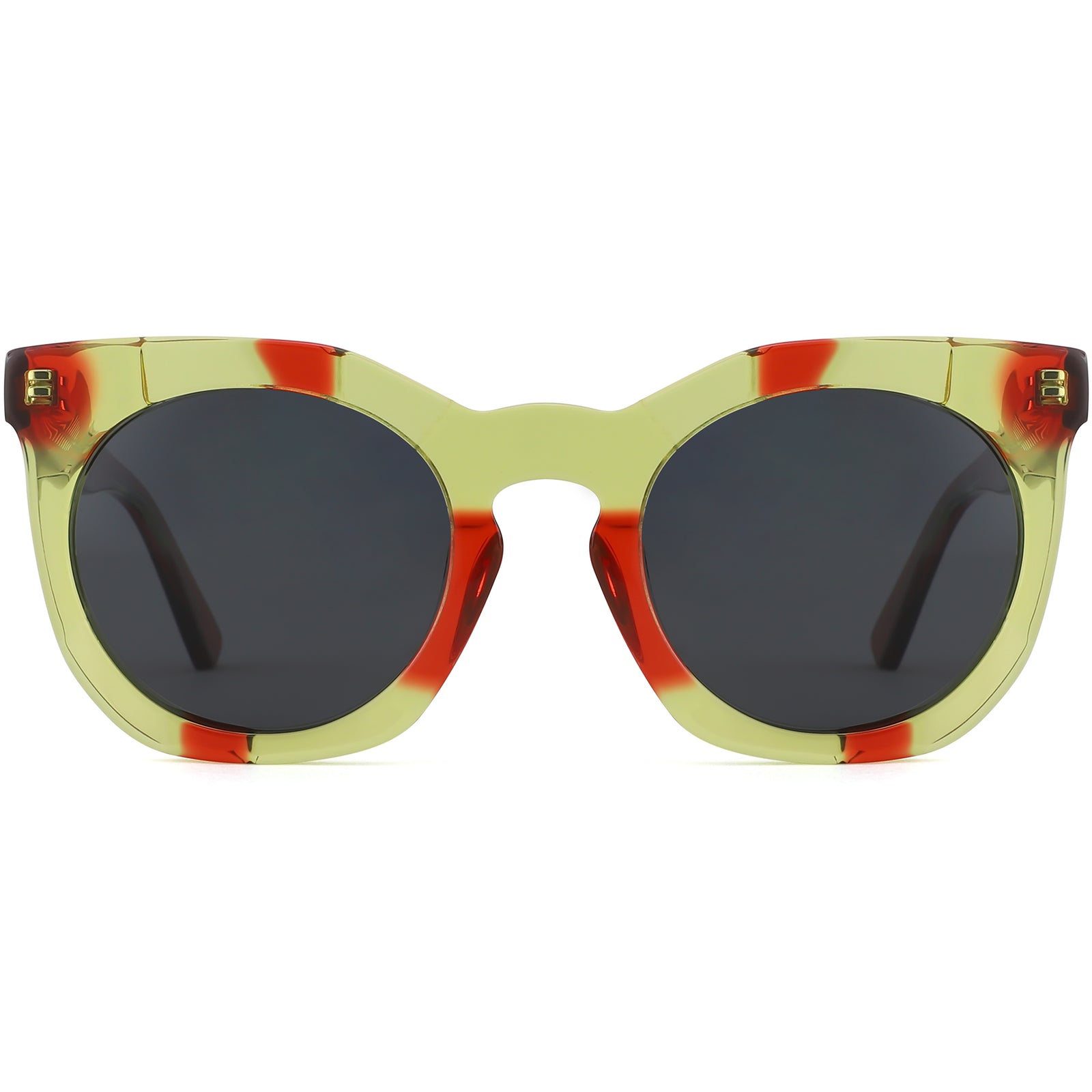 These sunglasses boast a bold, playful design with a vibrant acetate frame, perfect for anyone looking to make a colorful statement. The rounded lenses are framed by striking, translucent acetate, creating a fun, retro-inspired look. The color combinations used in these frames offer a unique mix of bold hues that add an expressive and cheerful touch to any outfit. The frame ferturing a keyhole bridge is made of high-quality acetate, providing durability while keeping the sunglasses lightweight and comfortable. The chunky temple arms feature decorative metal accents, adding a hint of flair to the bold design, quirky and trendy. The dark-tinted lenses offer 100% UV protection, ensuring complete shielding from harmful UVA and UVB rays while enhancing visual clarity in bright sunlight. The thick temples provide stability, ensuring a comfortable fit that stays securely in place.