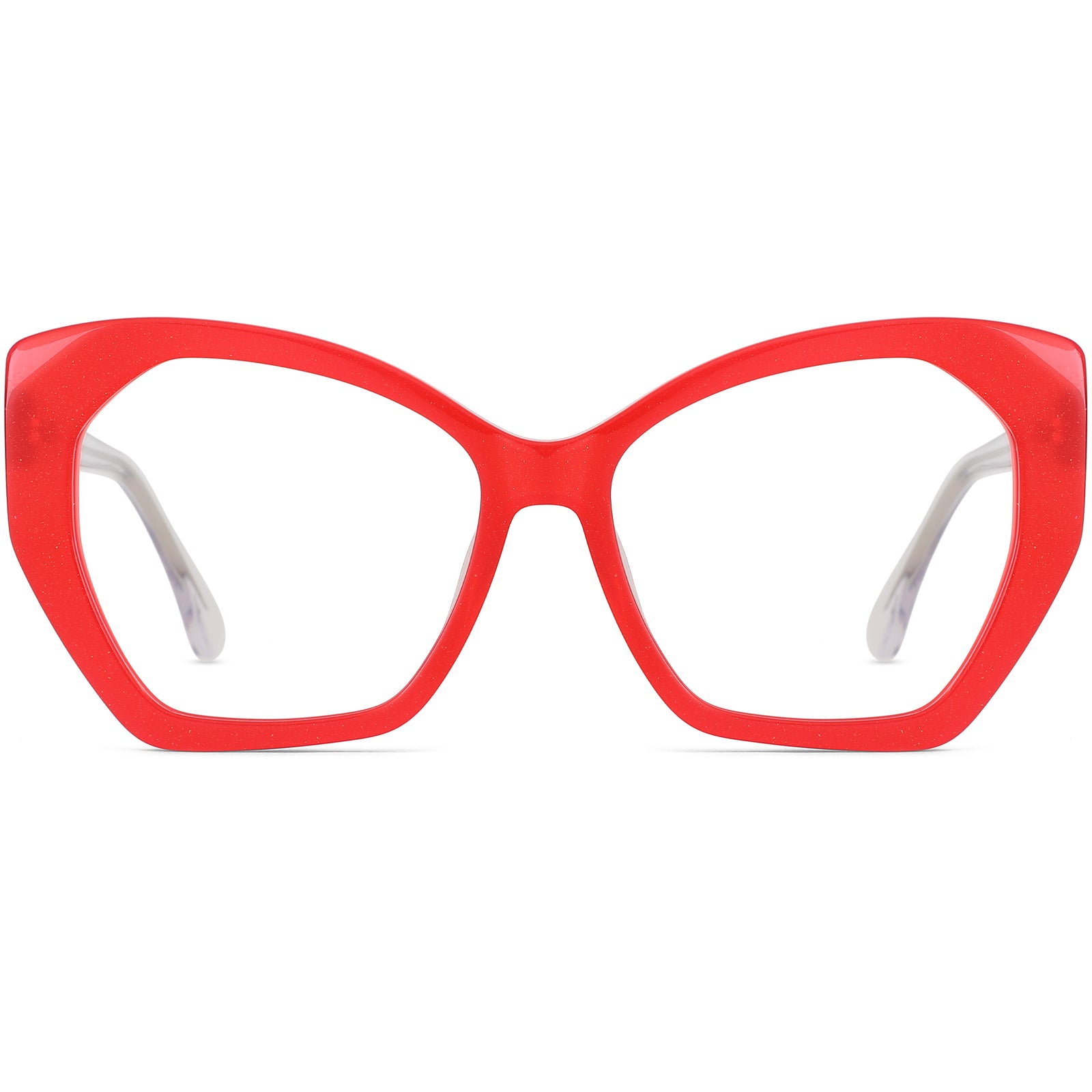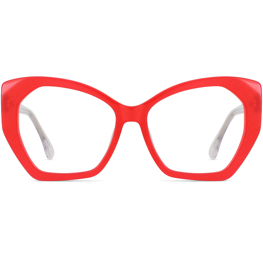 Embrace glamour with these oversized cat-eye glasses, perfect for big faces. Featuring a bold shape and crafted from clear and solid acetate with a hand-polished lustrous finish, they ensure a comfortable fit with spring hinges and an extended universal bridge. Available in black, red with translucent temples, gray with green temples, and translucent with blue temples. Ideal for chic sunglasses.