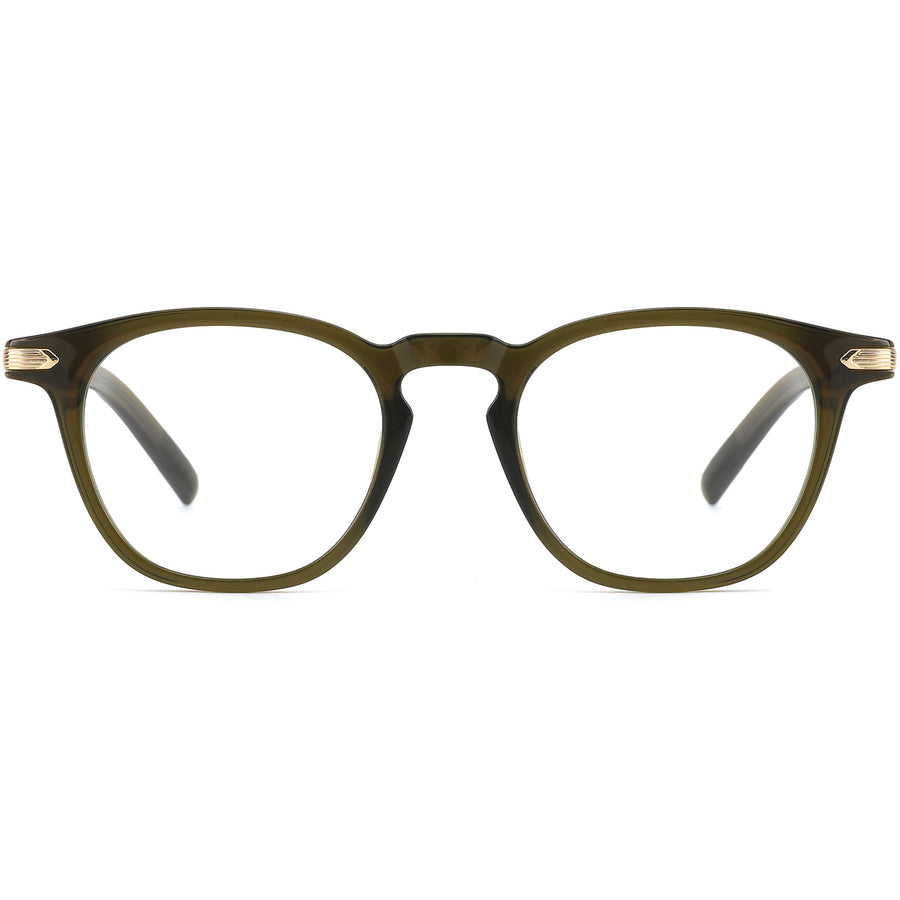 These square glasses feature a full-rim acetate frame with a glossy finish, designed for both men and women. A subtle metal detail elegantly connects the temple arms to the frame, adding a refined touch to the design. The keyhole bridge reduces pressure on the nose, enhancing comfort for all-day wear. With slim, clean lines, these frames offer a sleek and modern look. Available in green, blue, black, and tortoiseshell, they provide versatile style options for any wardrobe.
