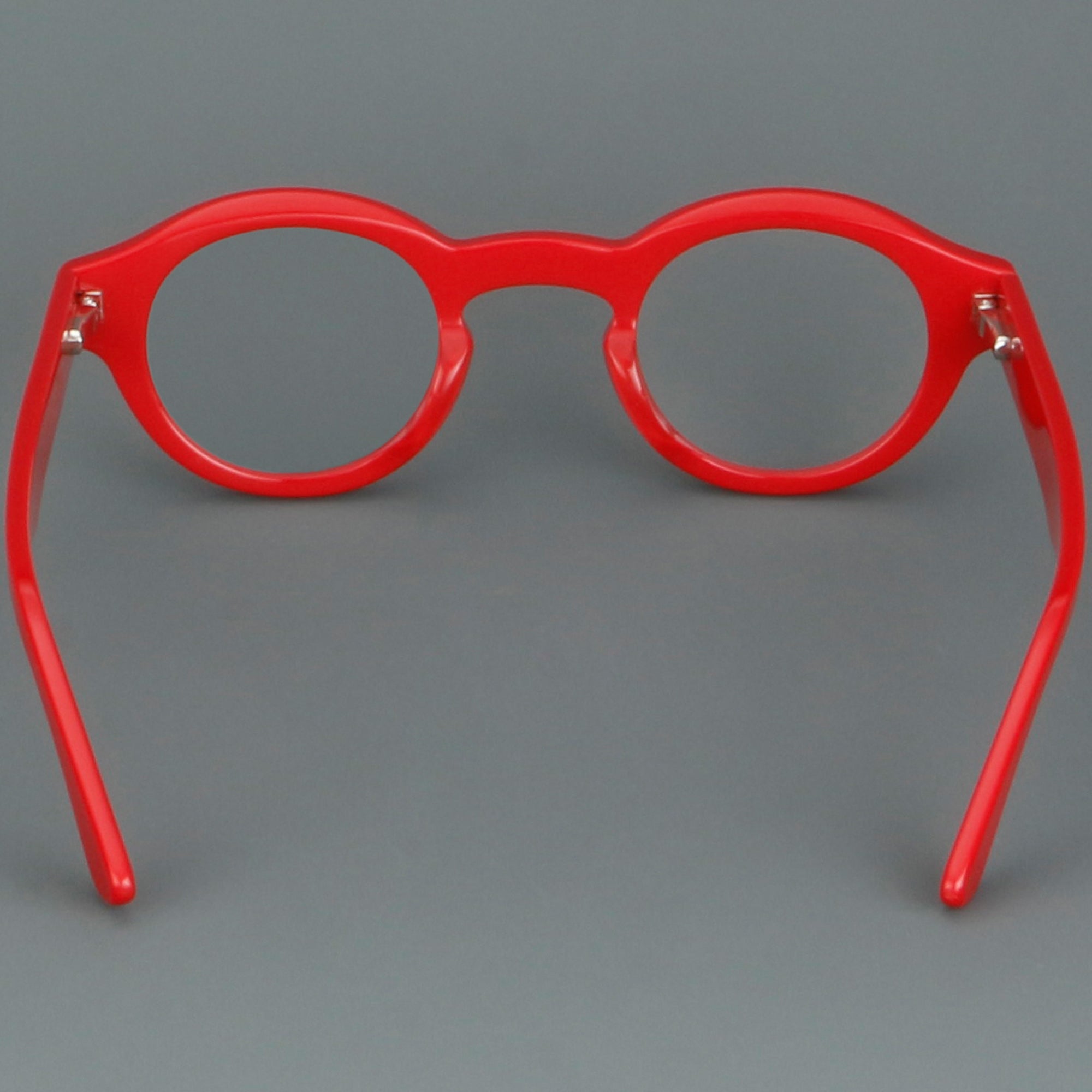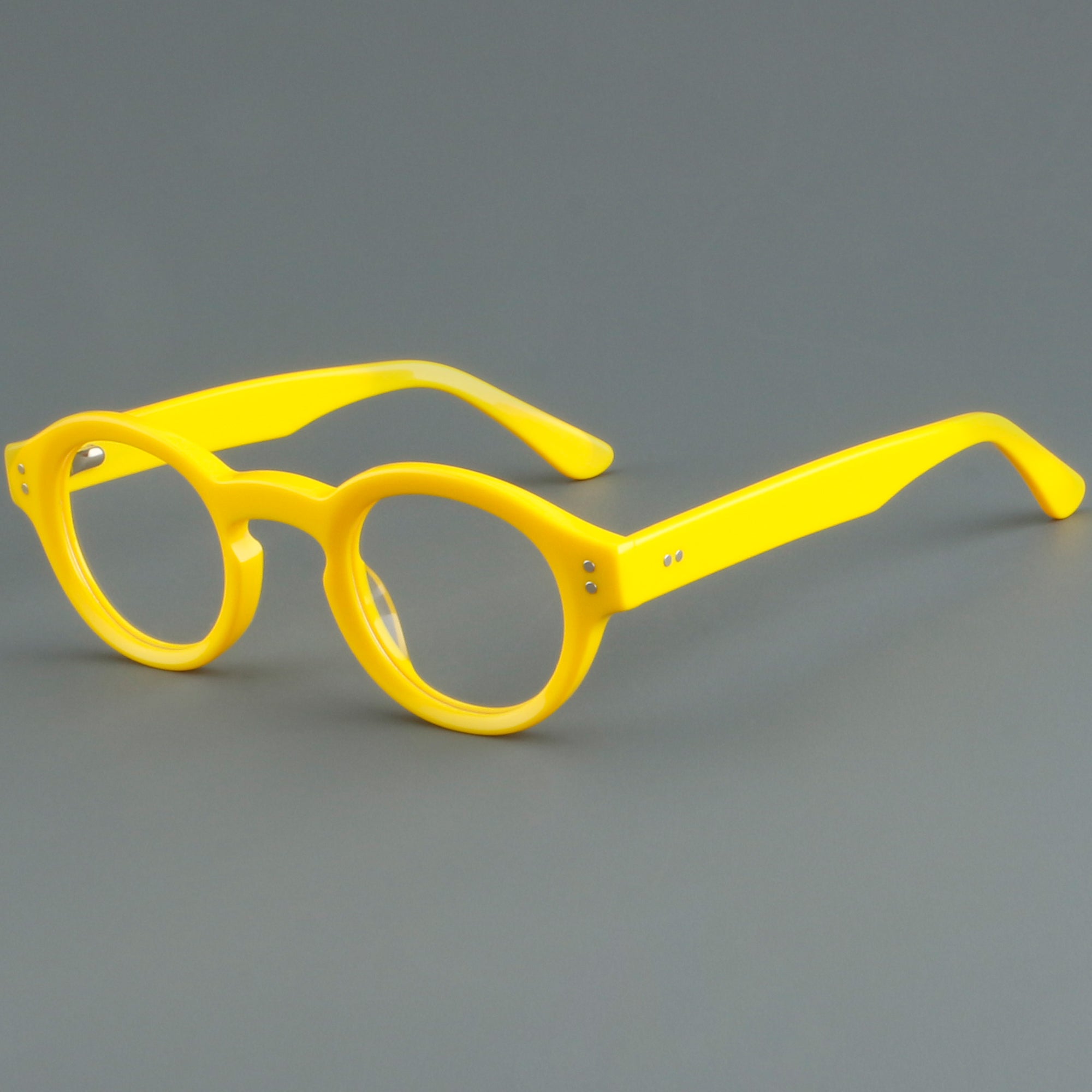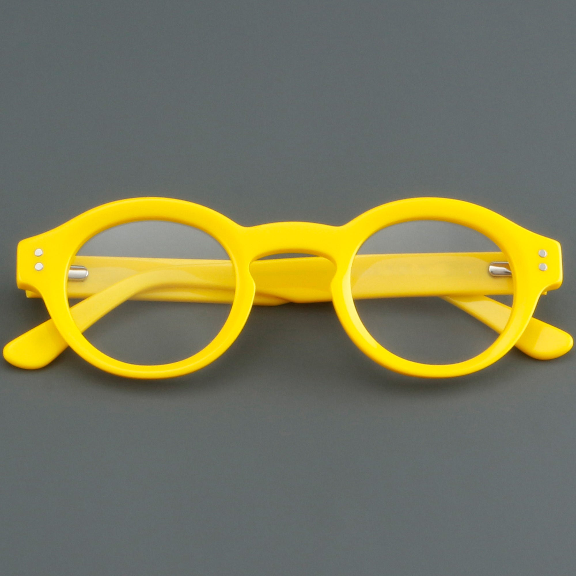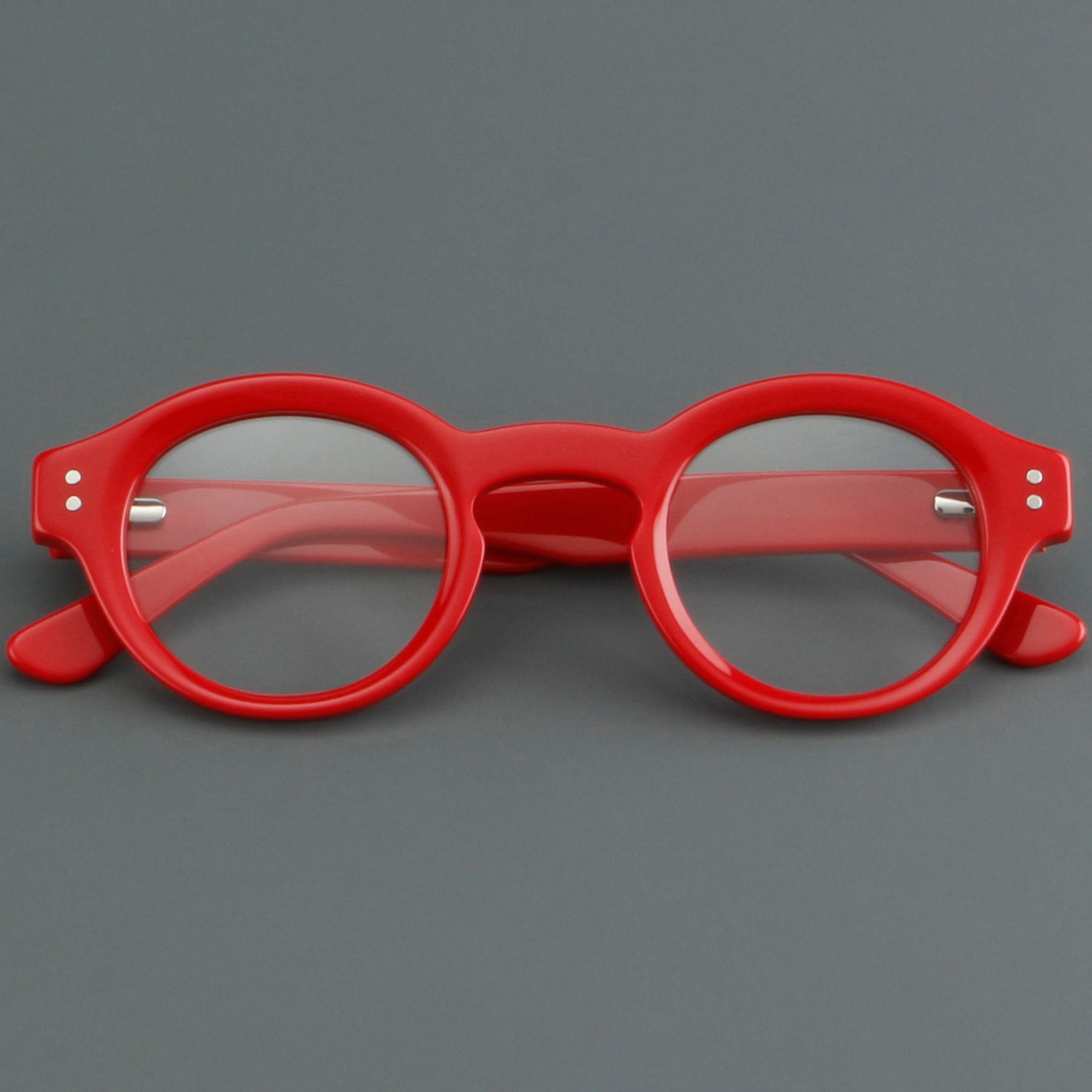 Bold round eyeglasses with keyhole bridge in full-rim acetate. The retro frame suits petite faces and teens. Smooth acetate front and arms, with integrated molded nose pads for all-day comfort. Secure riveted spring hinges add durability and a wider opening. Classic round shape with playful colors makes a statement for men or women. Ideal for optical or blue-light lenses. Shop lightweight, unisex acetate frames—full-rim, round glasses with spring hinges and built-in nose pads.