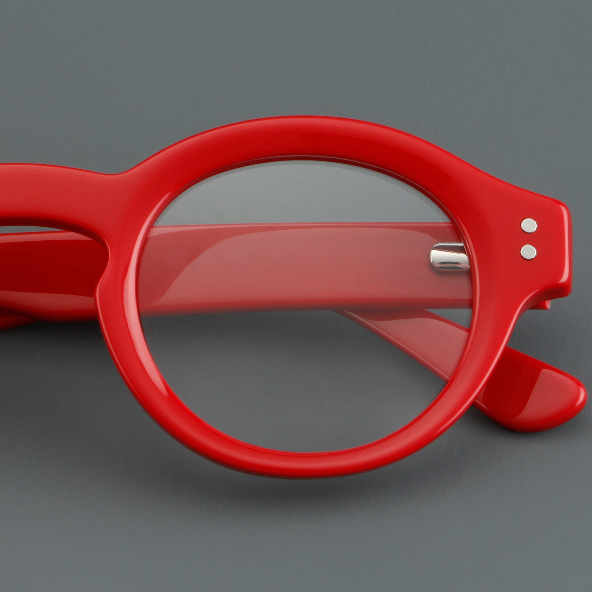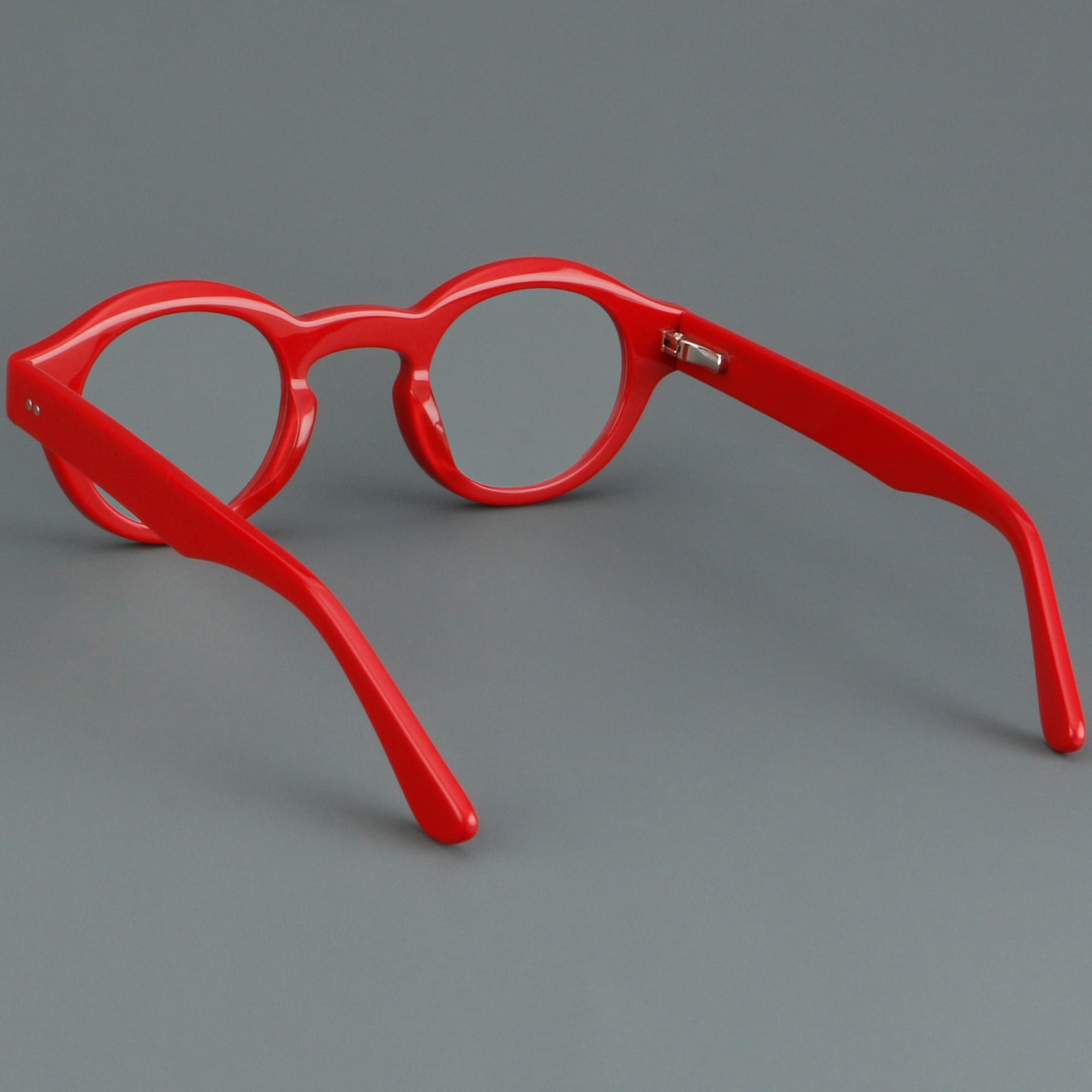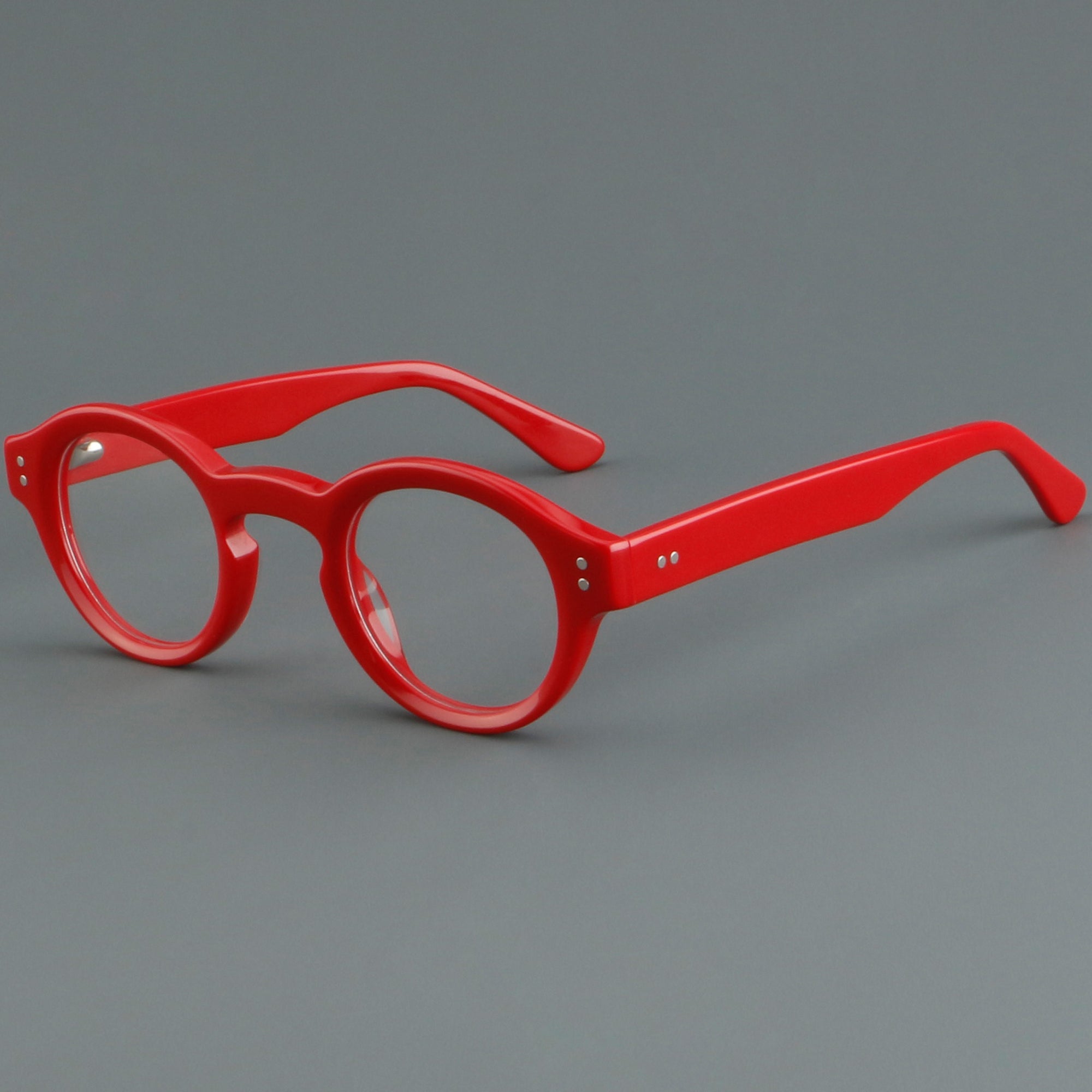 Bold round eyeglasses with keyhole bridge in full-rim acetate. The retro frame suits petite faces and teens. Smooth acetate front and arms, with integrated molded nose pads for all-day comfort. Secure riveted spring hinges add durability and a wider opening. Classic round shape with playful colors makes a statement for men or women. Ideal for optical or blue-light lenses. Shop lightweight, unisex acetate frames—full-rim, round glasses with spring hinges and built-in nose pads.