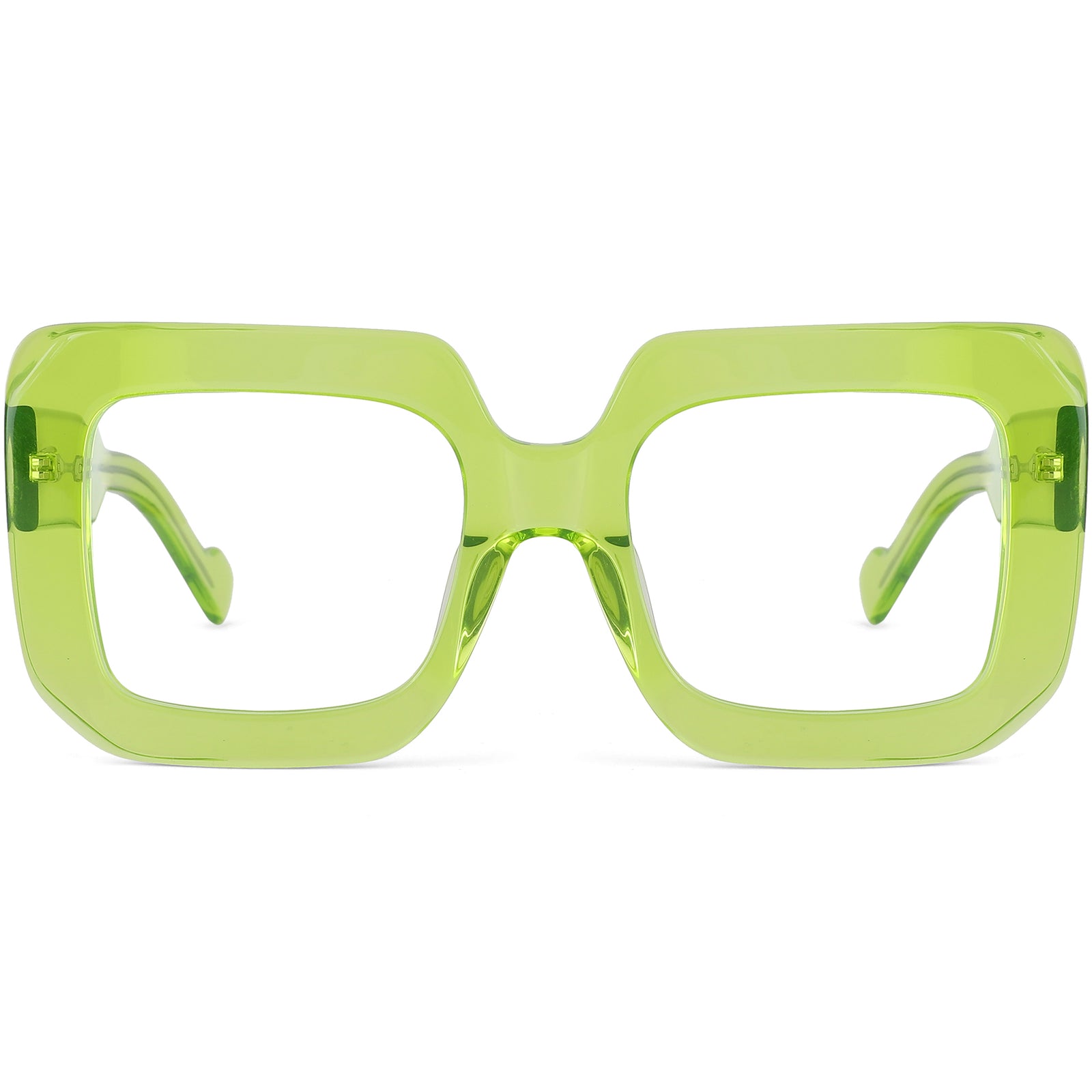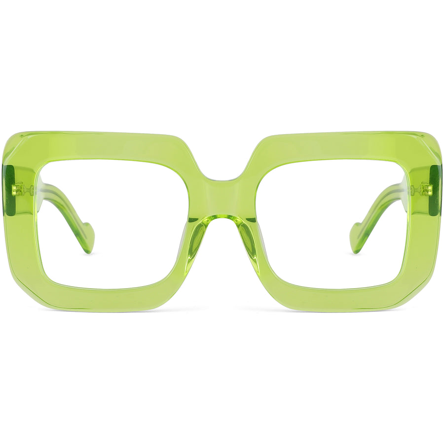 These unisex square glasses feature a bold design with transparent rims and chunky temple arms, crafted from the finest acetate for a striking yet comfortable look. Equipped with spring hinges, they provide enhanced comfort and an exact fit, perfect for all-day wear. Ideal for those with oval and heart face shapes, these frames come in clear, transparent green, blue, and black, offering versatile color options to suit any style.