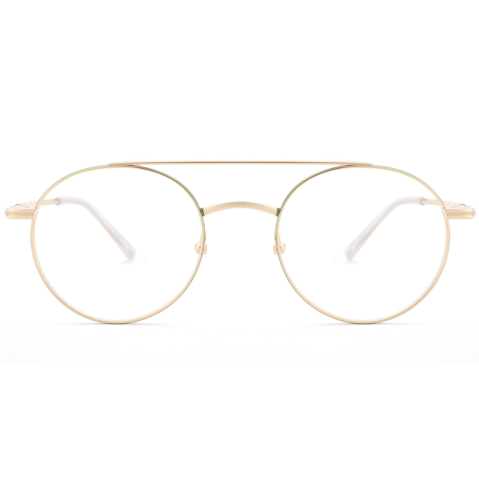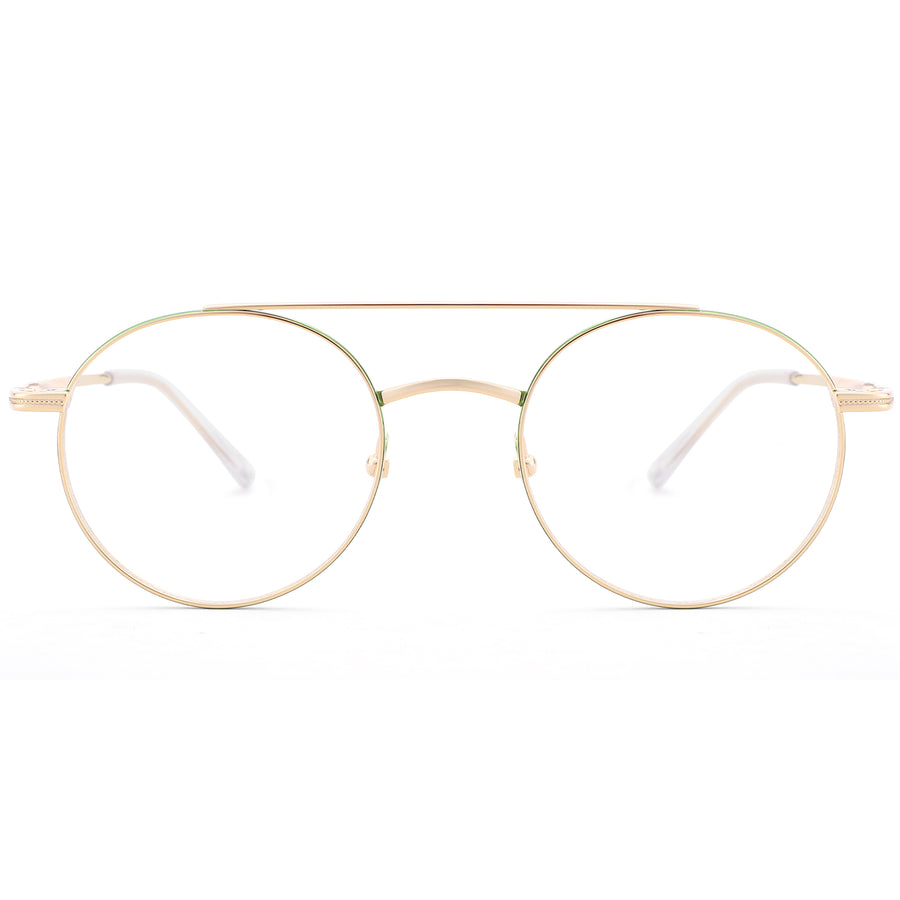 These modern round glasses feature a sleek metal frame with a unique double-bar design that adds a contemporary twist to a classic silhouette. The frames showcase a subtle contrast color along the rim, giving a fresh, stylish look. The lightweight construction ensures all-day comfort, while the adjustable nose pads provide a secure and personalized fit. The intricate detailing on the temples and slim arms offer both elegance and durability. Available in a chic gold with green accent, these glasses are perfect for those who appreciate a blend of modern sophistication and timeless design. Ideal for complementing round or oval face shapes, these frames offer style, comfort, and versatility for everyday wear.