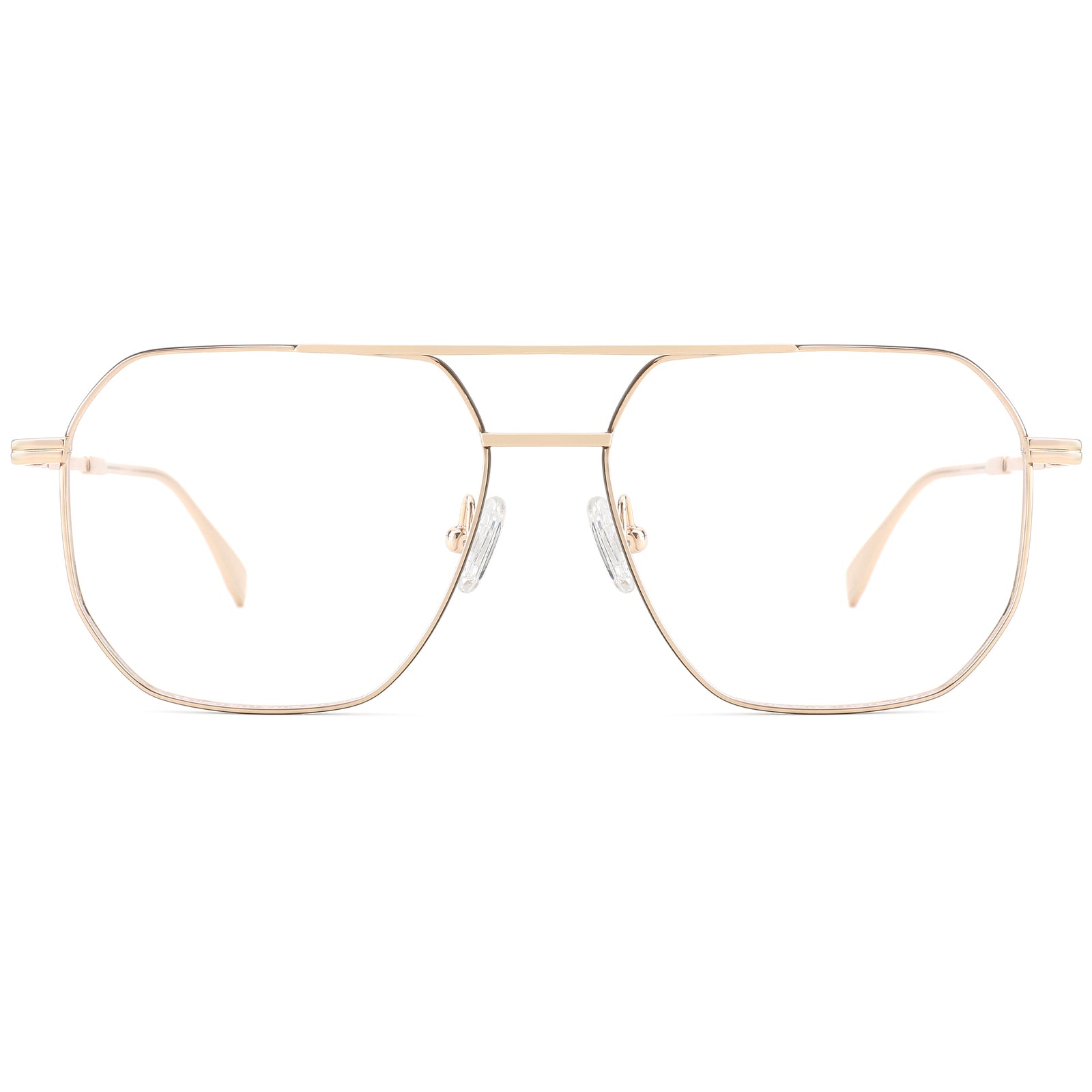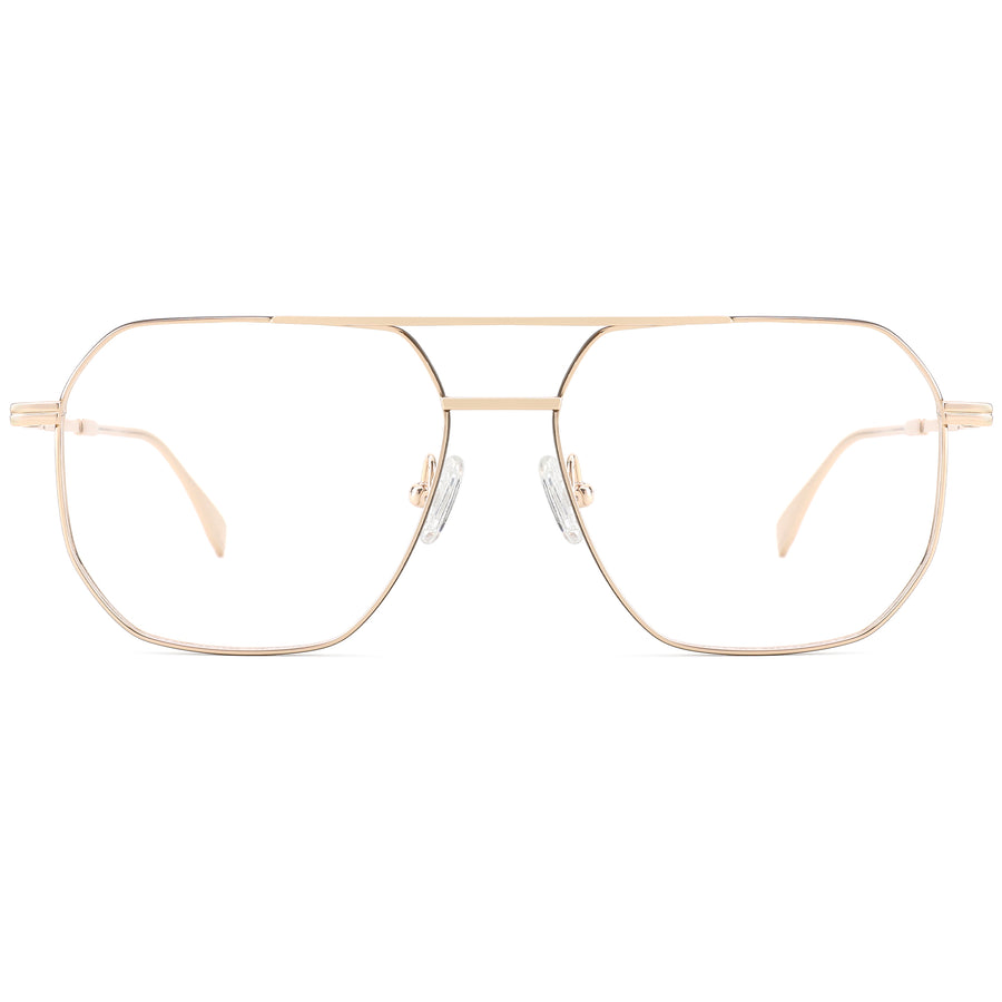 These aviator glasses feature an elegant flat top and double bridge, crafted from lightweight titanium for both style and durability. The oversized aviator-style frame is accentuated by striped detailing on the temples, adding a touch of sophistication. Adjustable nose pads ensure a comfortable, customized fit, while the streamlined temple tips provide secure wear for all-day comfort. Perfectly suited for heart and oval face shapes, these glasses combine classic aviator aesthetics with modern design elements, making them an ideal choice for everyday wear.