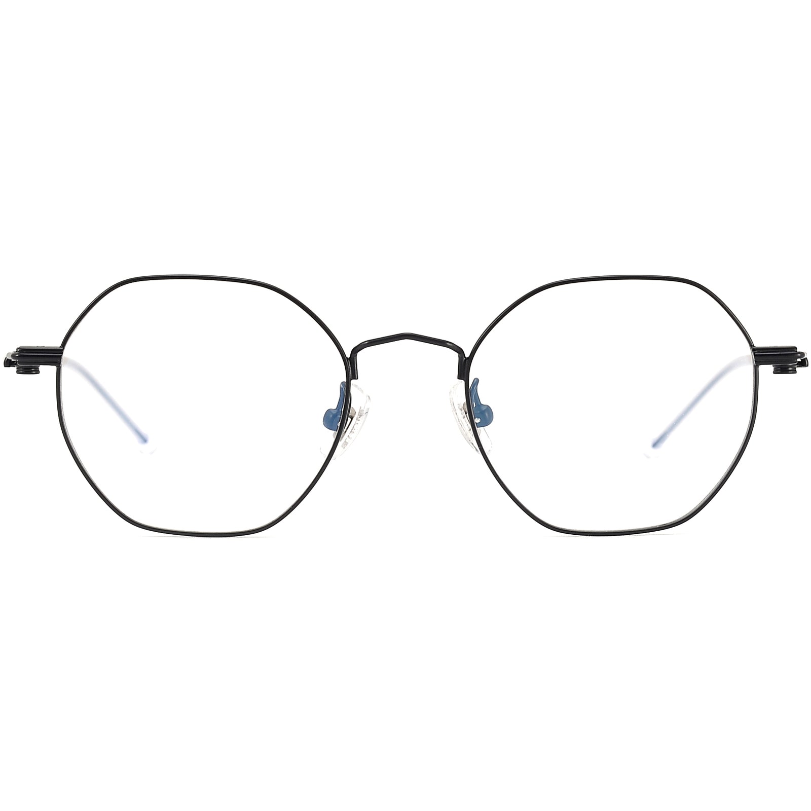Lightweight geometric titanium eyeglasses with a modern octagon/round silhouette. These ultra-slim metal frames feature flexible coil hinges, adjustable silicone nose pads, and soft jelly temple tips for day-long comfort. Hypoallergenic titanium offers exceptional durability without bulk, creating a minimalist, unisex look that flatters most face shapes. Perfect as everyday blue-light or prescription eyewear. Shop these geometric titanium glasses for a sleek, fashion-forward style with featherweight comfort.