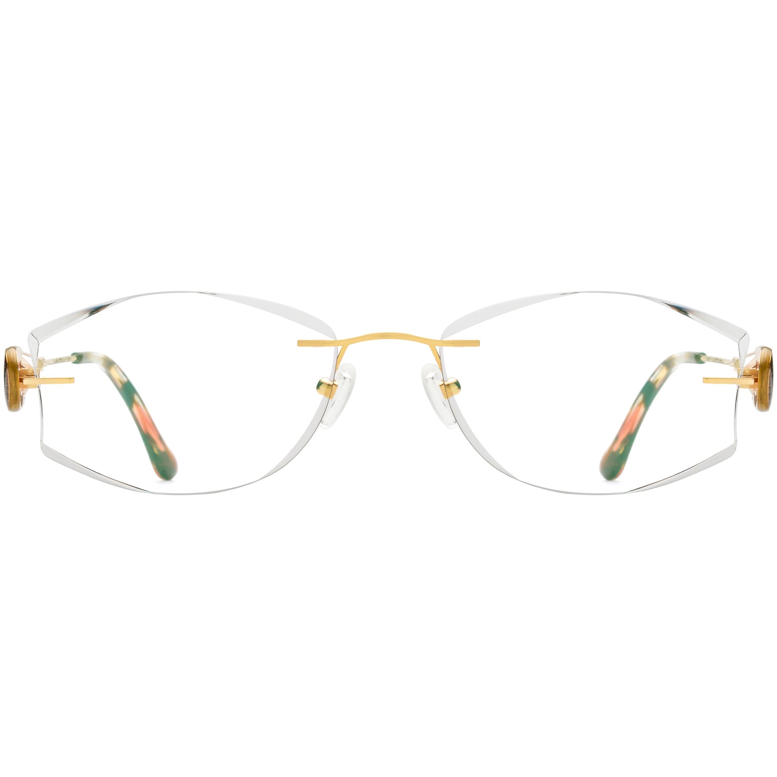 These exquisite oval glasses for women feature a rimless design with beautifully crafted diamond-cut lens edges, exuding elegance and sophistication. The slim gold temple arms are complemented by a teardrop rhinestone at the hinge, adding a touch of glamour and showcasing impeccable craftsmanship. Designed for both style and comfort, the silicone nose pads provide a secure and refined fit, making these glasses a perfect blend of functionality and timeless beauty.