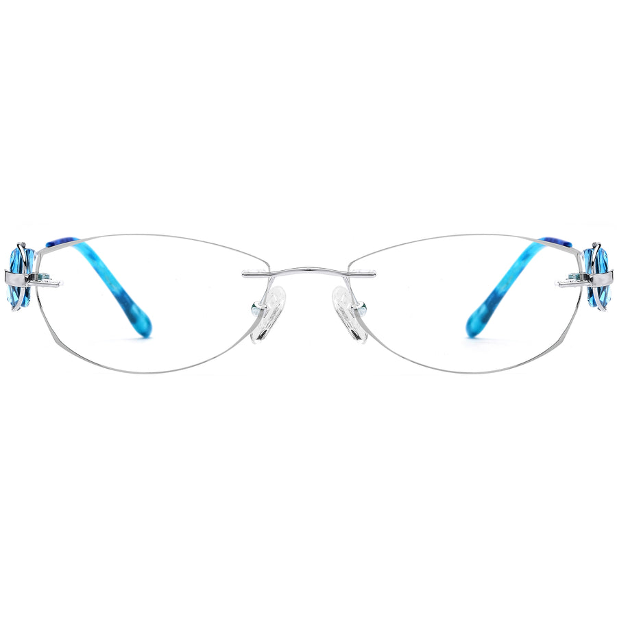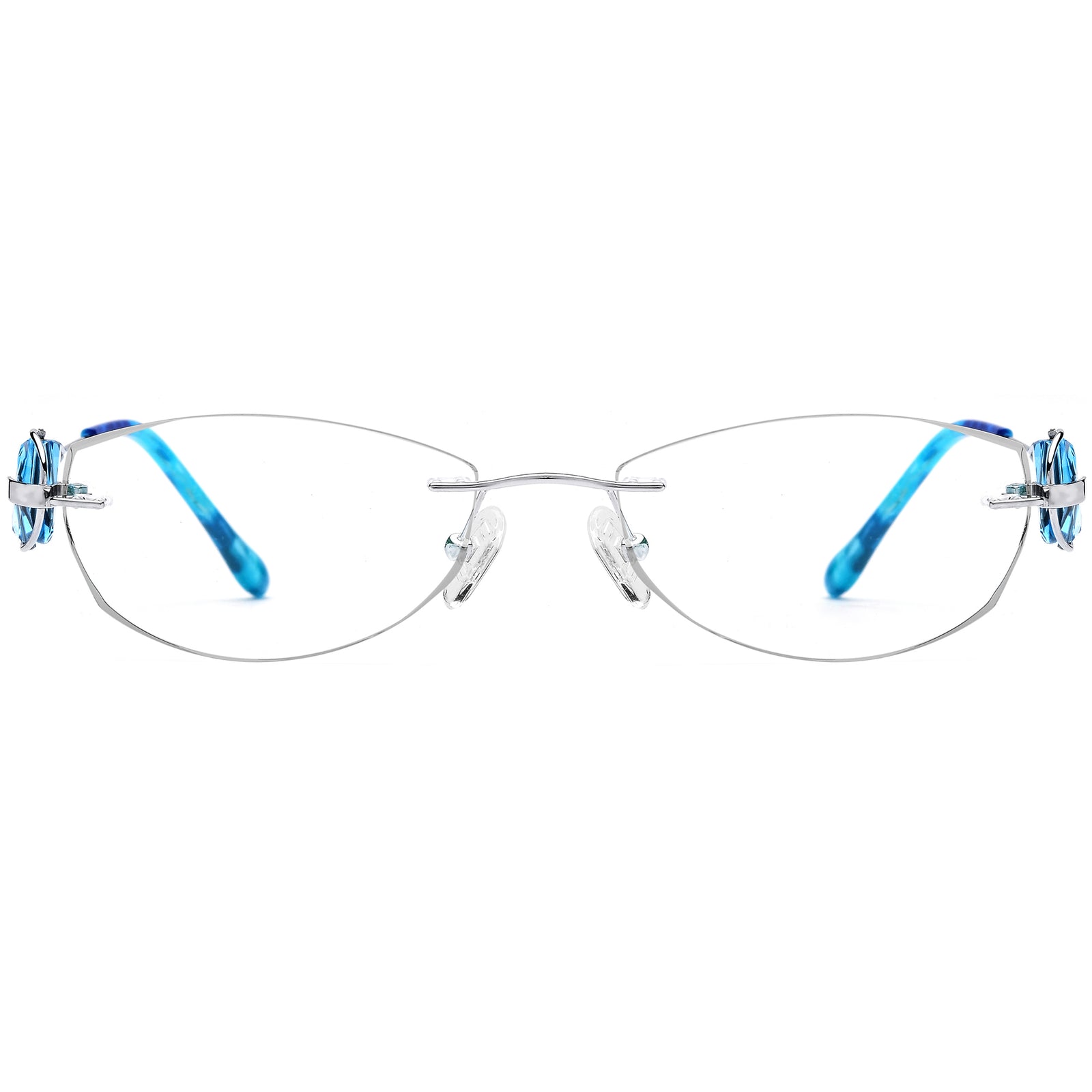 These elegant women's oval glasses feature a sleek silver, rimless design that combines lightweight comfort with sophistication. The oval lenses are crafted using diamond cutting technology for a polished, refined look, while blue rhinestones add a pop of sparkle and charm. Slim titanium temple arms with a unique crossed design complete the frame, offering both style and grace. Perfect for enhancing square or diamond-shaped faces, these glasses are a stunning choice for a timeless yet modern accessory.