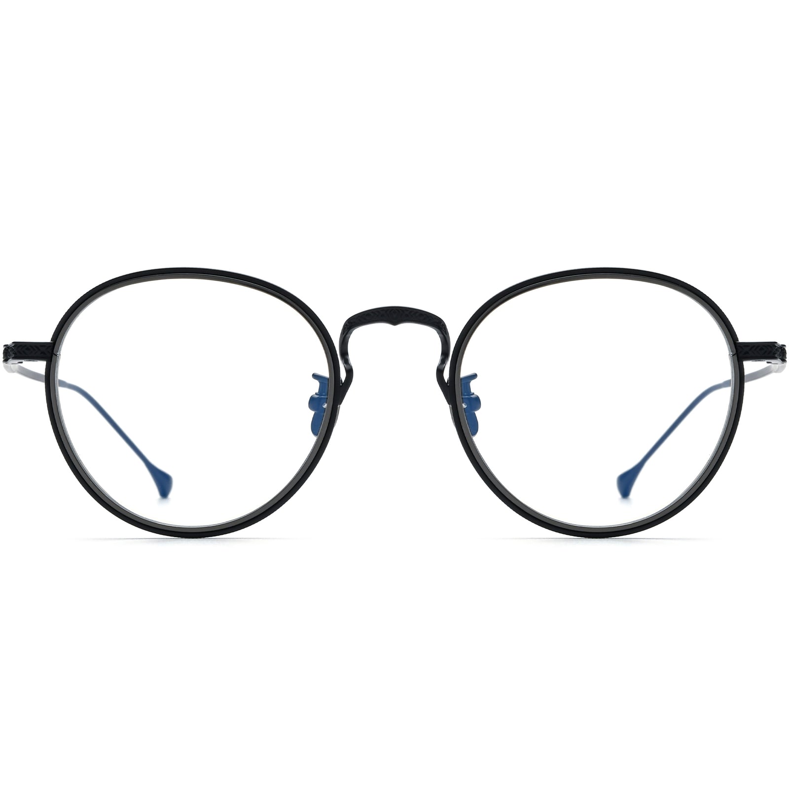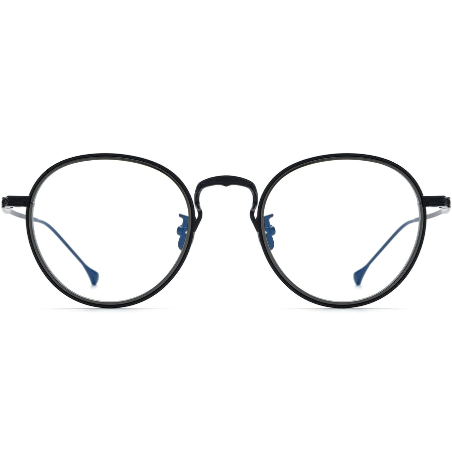 These antique round glasses for men and women feature a titanium frame with delicately engraved details, exuding a refined and sophisticated look. The distinctive keyhole bridge adds a vintage touch, while the slim rims and temple arms provide a sleek, minimalist style. Equipped with titanium nose pads, they ensure optimal comfort and a secure fit for extended wear. Perfect for square or diamond face shapes, these glasses offer timeless elegance with modern functionality.