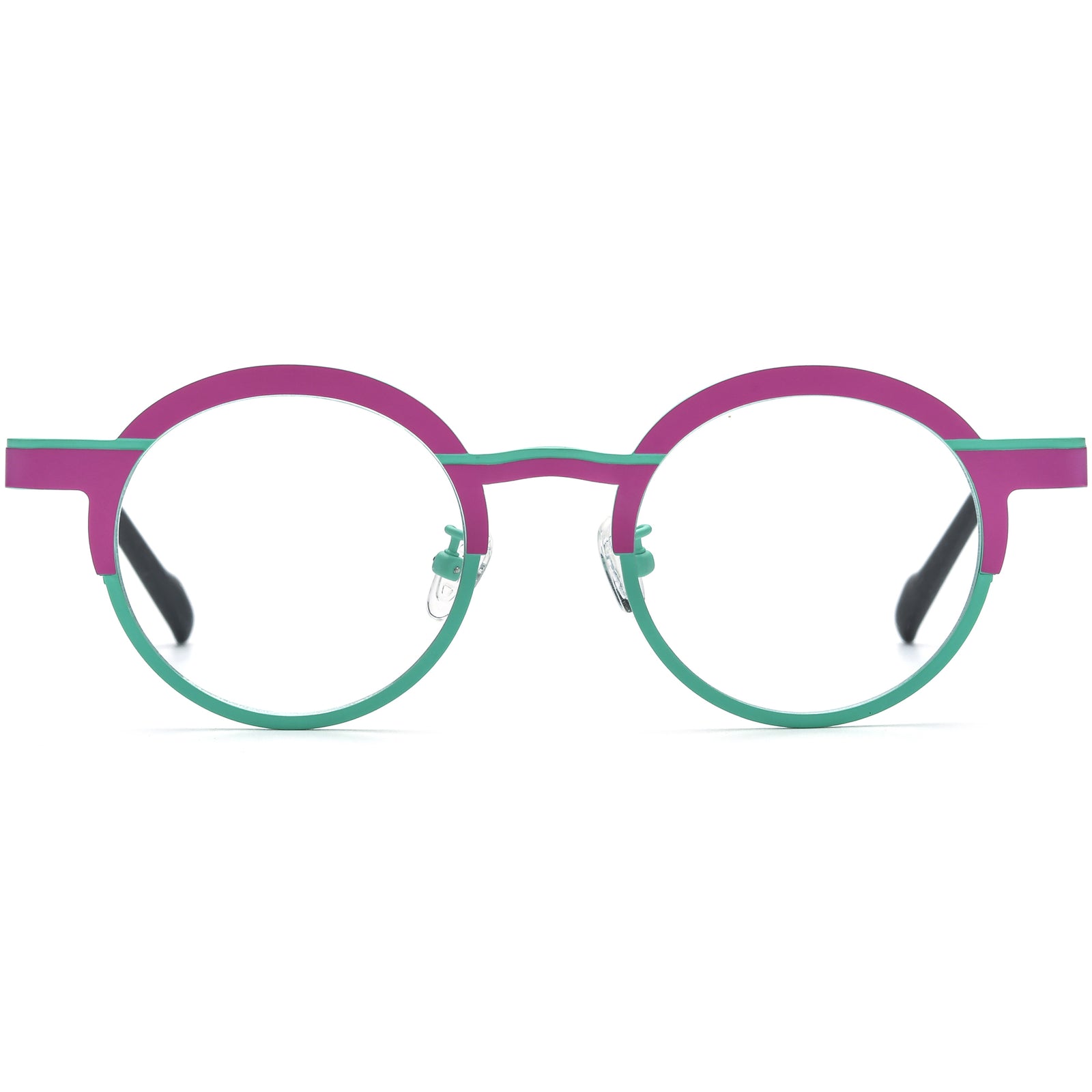 These eye-catching geometric frames offer a round lens shape crafted from high-quality titanium, ensuring lightweight durability. The distinctive double-layer design features a bold browline and keyhole bridge, creating a unique aesthetic. Cut-out details on the temple arms add an extra modern touch, while the frames come in vibrant dual-tone colors for a striking look. Equipped with adjustable nose pads for added comfort and a secure fit, these glasses are perfect for those looking to make a statement with their eyewear.