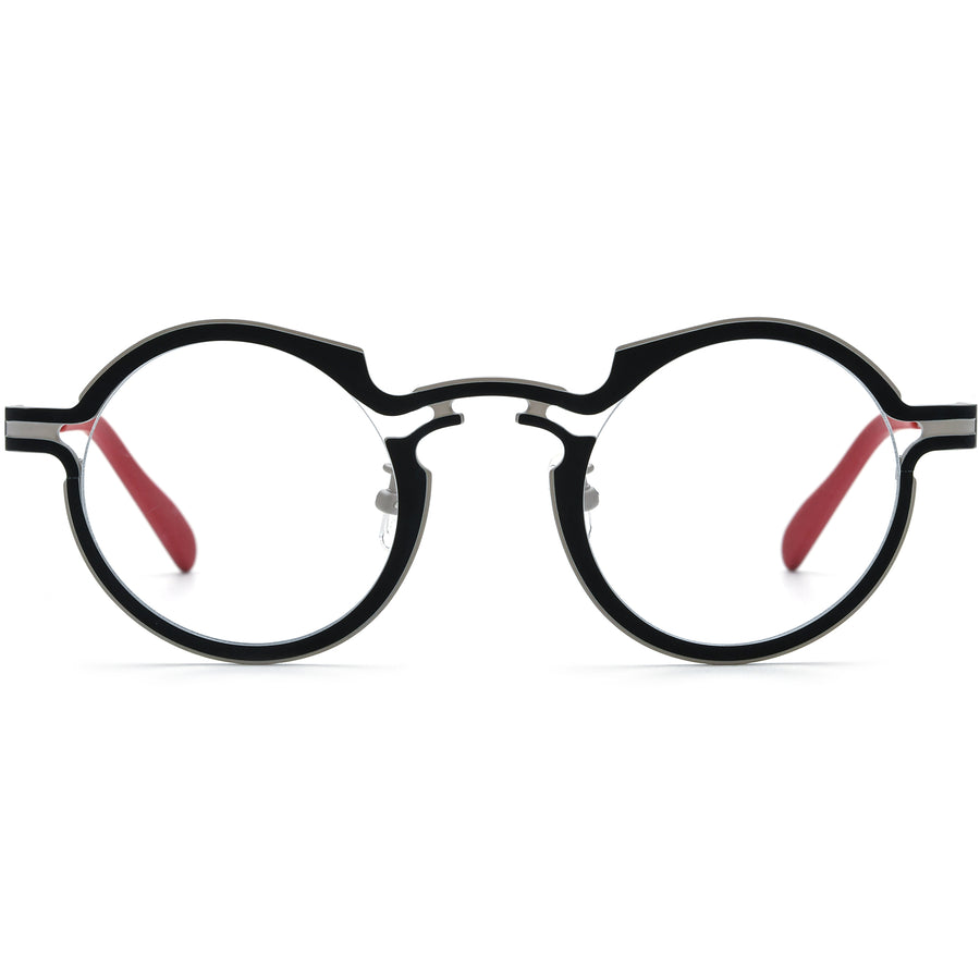 Embrace a contemporary, avant-garde look with these titanium eyeglasses featuring a round silhouette and a distinct keyhole bridge. The double-layered frame boasts bold color combinations and intricate cut-out designs, delivering a playful and stylish flair. The temple arms showcase a slim, cut-out detail, ending in contrasting tips for added comfort and grip. Ultra-lightweight titanium ensures durability and hypoallergenic wear, while adjustable nose pads provide a secure, customized fit. Available in various bright hues for a standout, modern aesthetic.